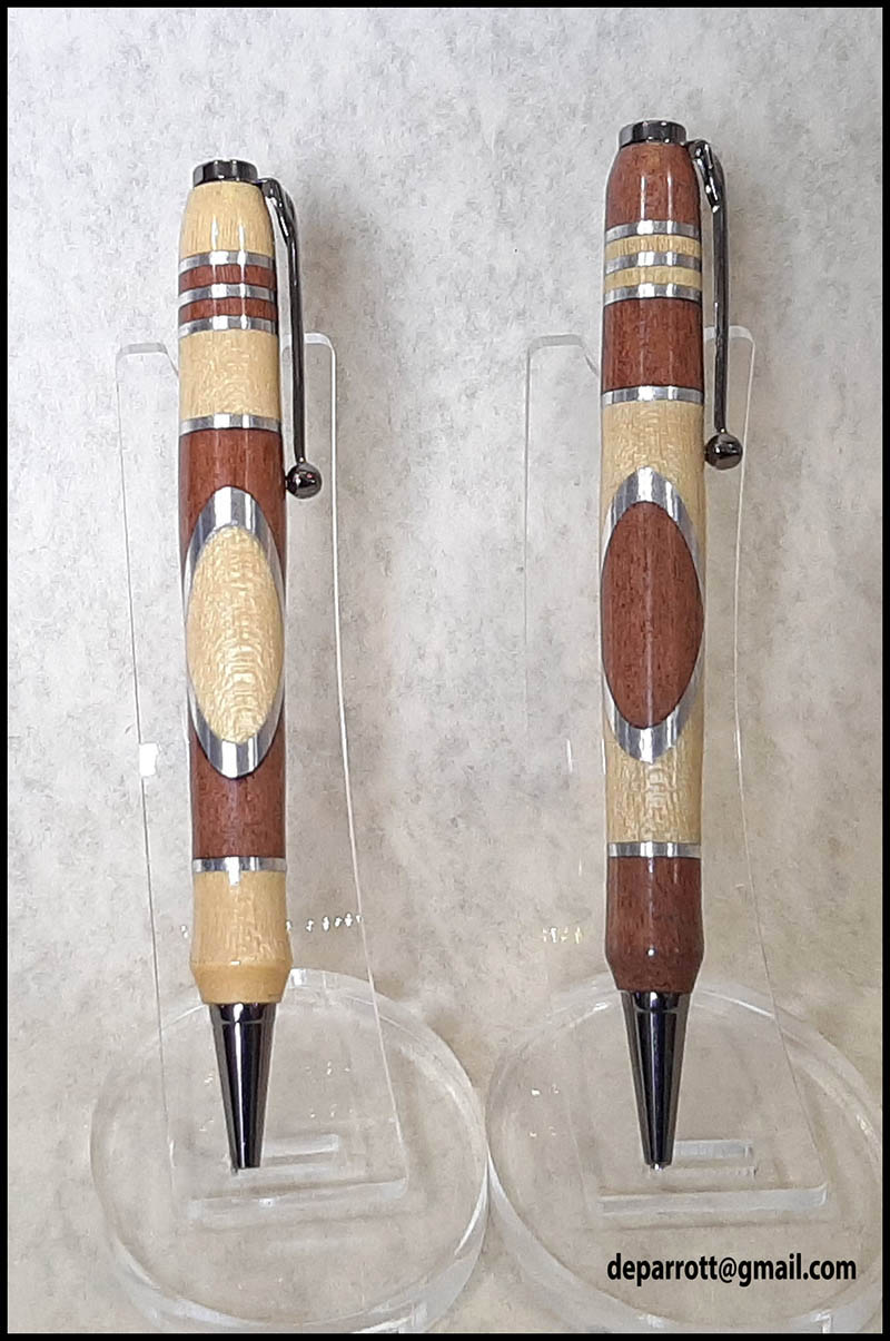 I started with 2 blanks of different colors and began cutting and adding the 1/16" aluminum. The pen kits are just regular Fancy Gun Metal Slimlines (by PSI) but made without a centerband. You advance the ink by twisting the nib. I know someone will ask so I'll tell you now it's all held together with CA glue. The shaping and turning was done without sandpaper because of all the aluminum. I did use 800, 1000, and 2000 grit in the CA finishing. Hope you like them.