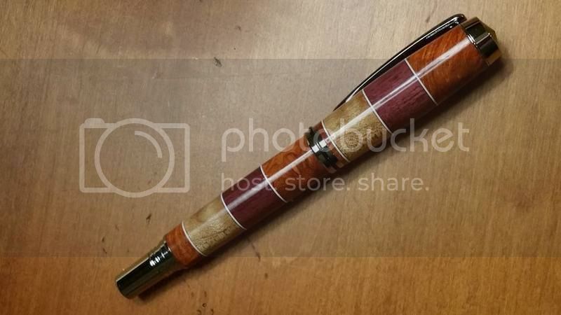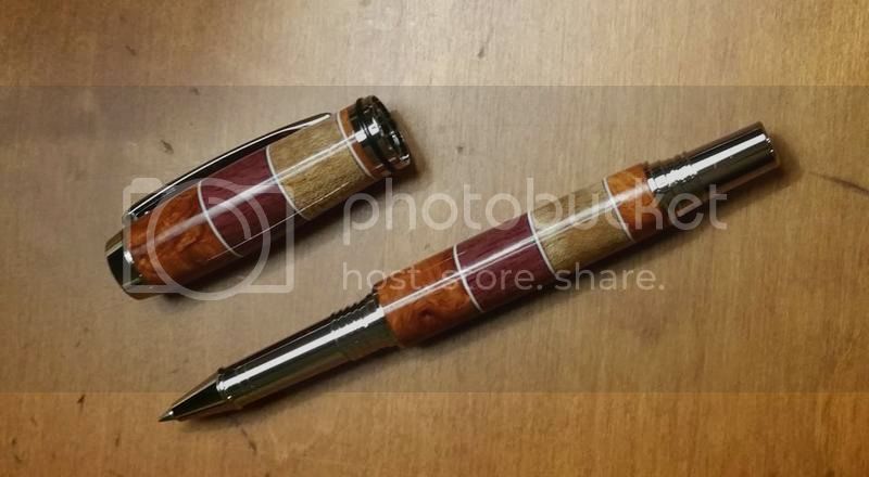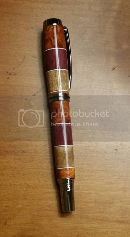 I like to use my Amboyna sparingly so I've been using it in a bunch of segmented blanks I'm preparing. I also used purpleheart and regular old pine dimensional lumber form Lowes. I'm very pleased with how it turned out on the chrome Jr. Gent II.