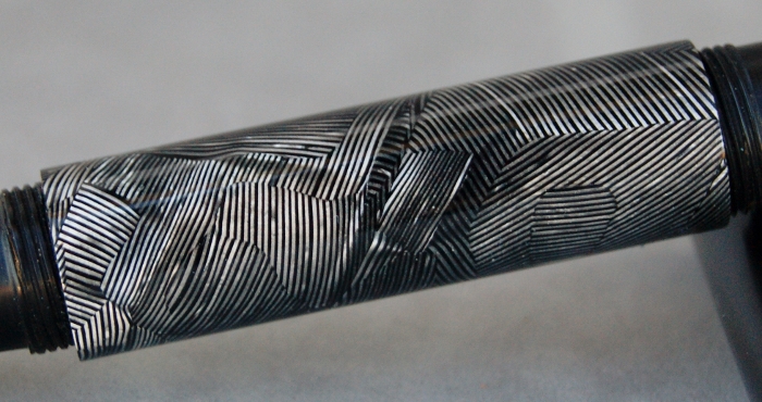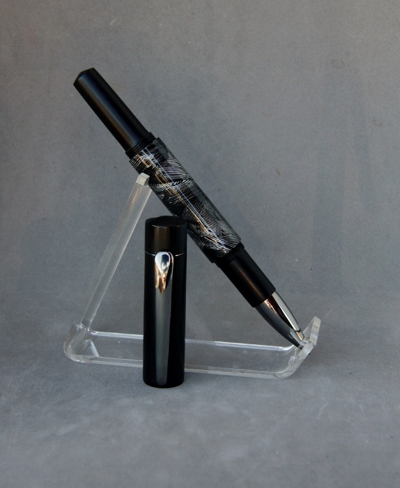 For materials I used my all time favorite vintage cellulose acetate. This was the last of what I had. The rest of the pen is made up with Japanese black ebonite. The clip and nose cone are black titanium (yes I robbed a zen for the nose cone :rolleyes:). I thought the colors would play well with the cellulose acetate.
