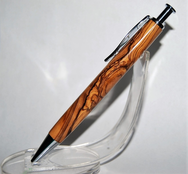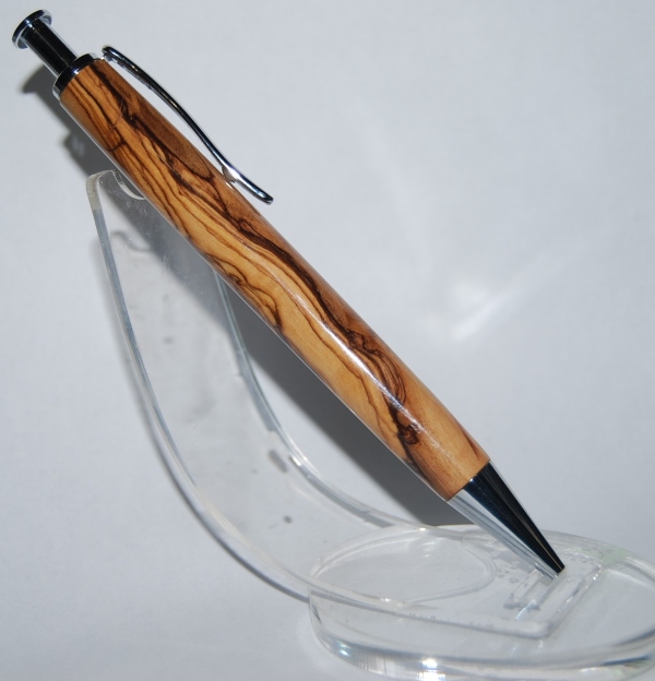 The wood I chose was a piece of Bethlehem Olive Wood I had laying around. The finish is 5 coats of thin flex ca. This was fun to make, as it's the last pen for me for a while. I'm in the process of moving into an apartment, and have no room for a lathe. But I have good friends from IAP that will allow me to swing by and use theirs :0