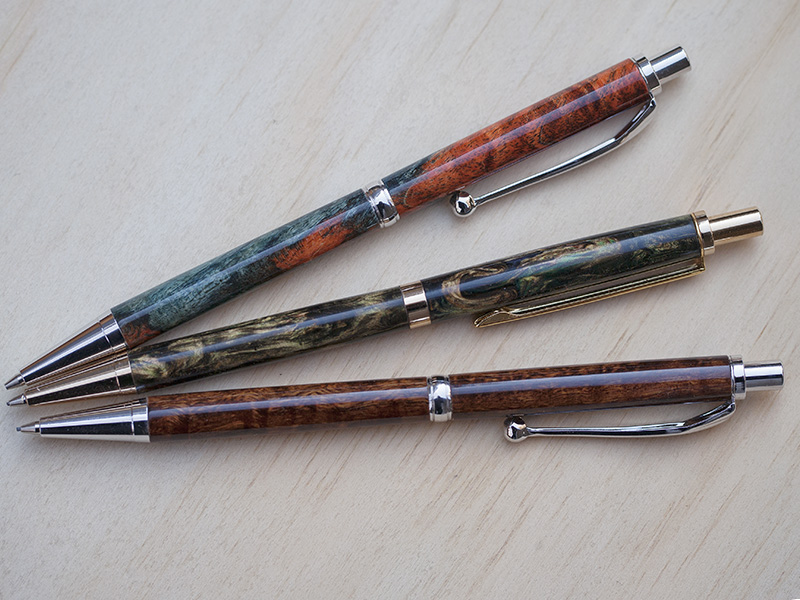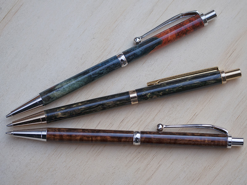The resolution to clean-up and bring some order to my shop area didn't go very far last night... I stumbled on a box of "slimline" blanks (about 1/2" squares), then I got the idea stuck in my head that I had to check whether I could still turn slimlines. Anyway, long story short, epoxy-glued overnight, turned and GluBoost finish this morning