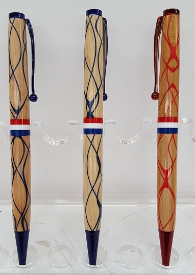 A couple serpentine slimlines using blue veneer. I also wanted to see what the red would look like. I like how they turned out. Hickory blanks, CA finish.