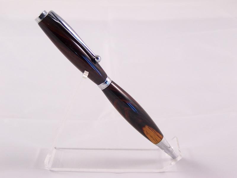 These are some pens i made this weekend. First is a cocobolo with ca finish 5 coats of thin, on a chrome slimline.(im trying to get rid of them). Second is a freebie blank from woodpenpro the guy threw in my box. It turns nice but melts easy when turning. polished to 12k then plastic polish. 3rd is one i just did 20 min ago, it is a pink ivory blank i got gilmers down in portland. It turned really good, and i got to practice my skewing. 5 coats thin ca then mm12k then plastic polish. I got some video of me turning the pivory pen so maybe i cant make a vid. =) hope you enjoy. please comment, tips are always helpful!