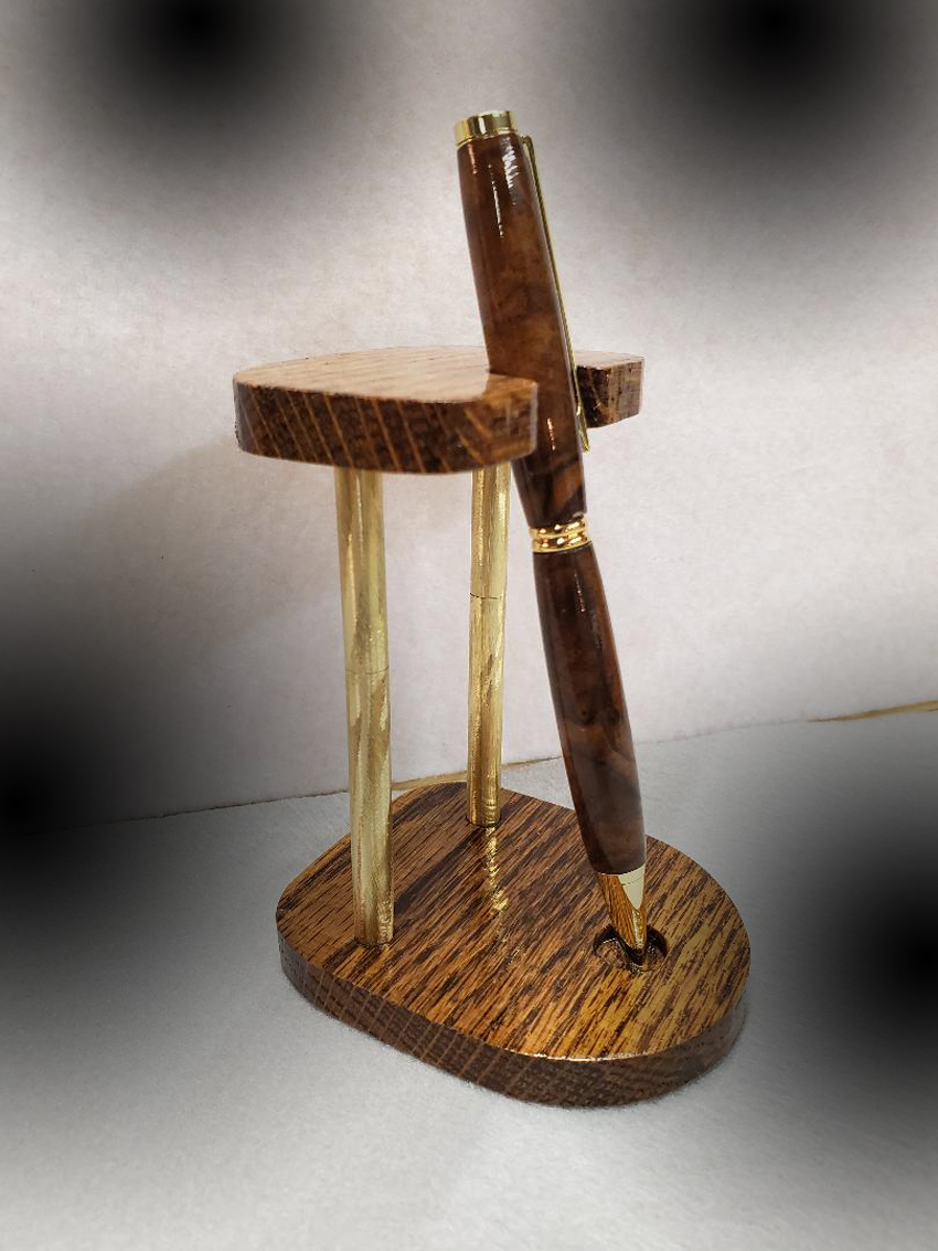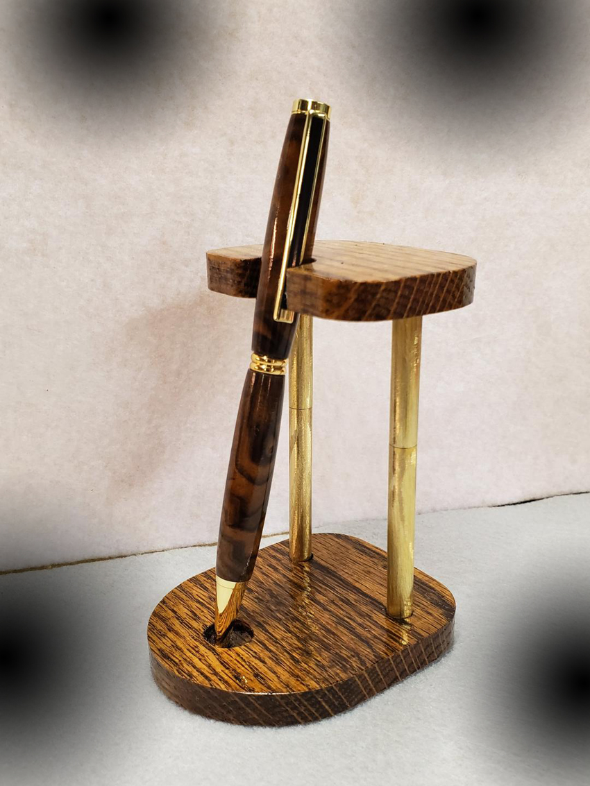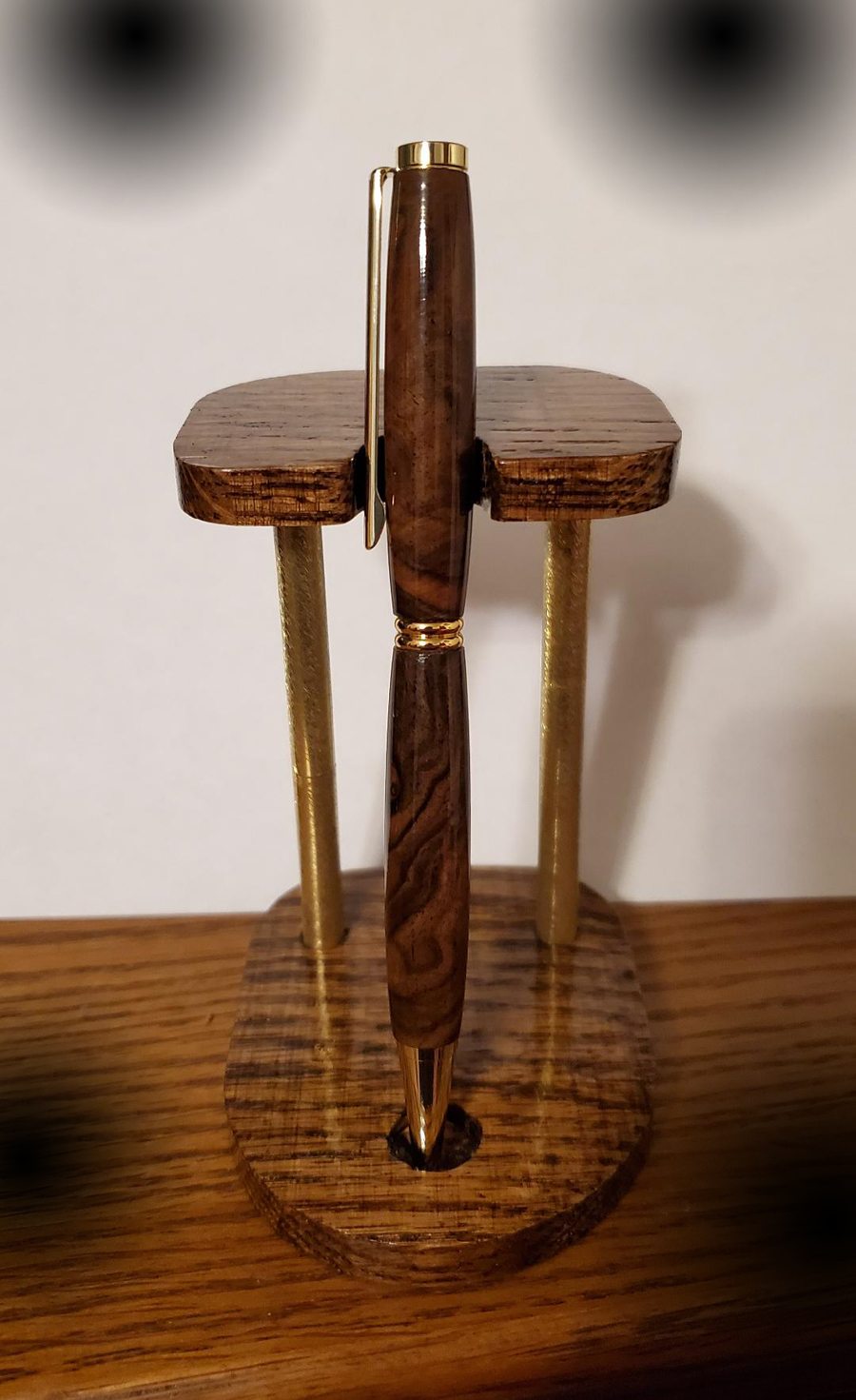Thanks Larry. Yea I needed something to put my pen on trying to picture them a little better. Had a couple small pieces of oak laying around and I doweled a couple 7mm pen tubes together. LolWhatever wood it is, the pen looks really good!!! I also like the pen stand, simple but nice.