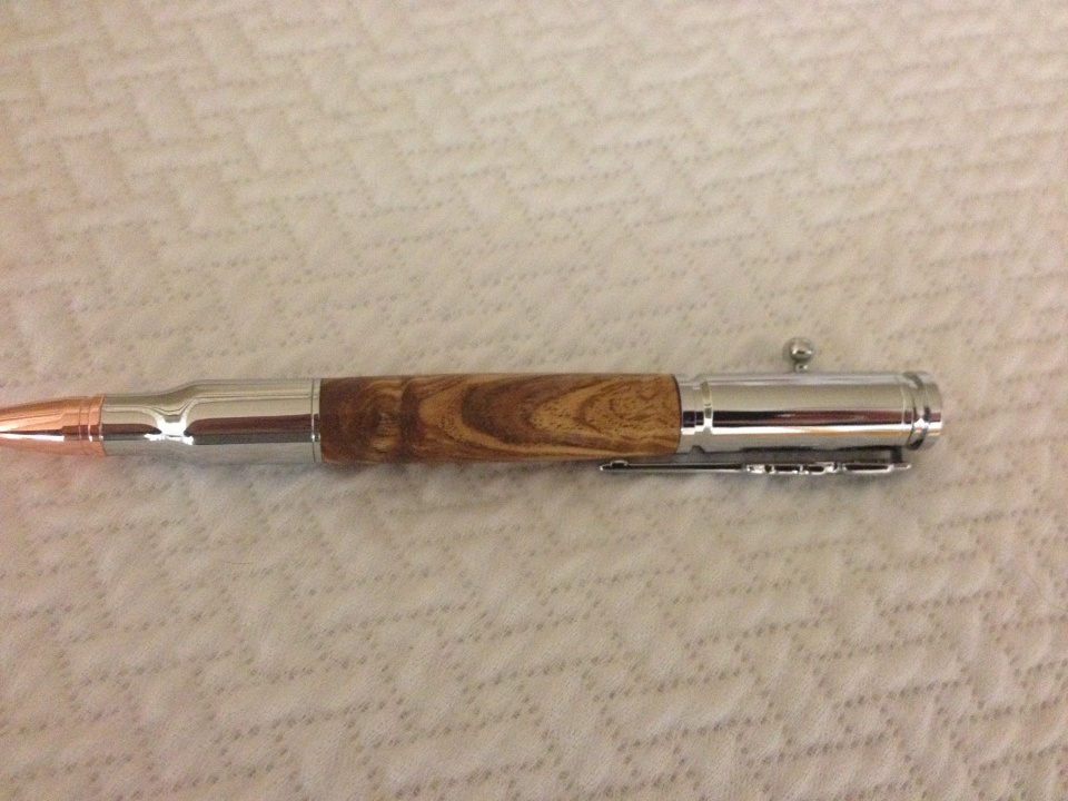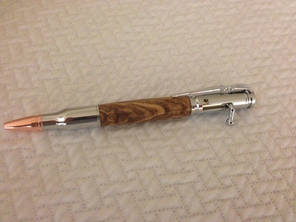 Fresh off the lathe. The guy that I purchased the wood blanks from called them "Mystery Wood" meaning he really didn't/couldn't remember what they were. Exhibition Grade Olivewood Burl was his guess. Whatever wood it is, it is stunning on this Bolt Action.