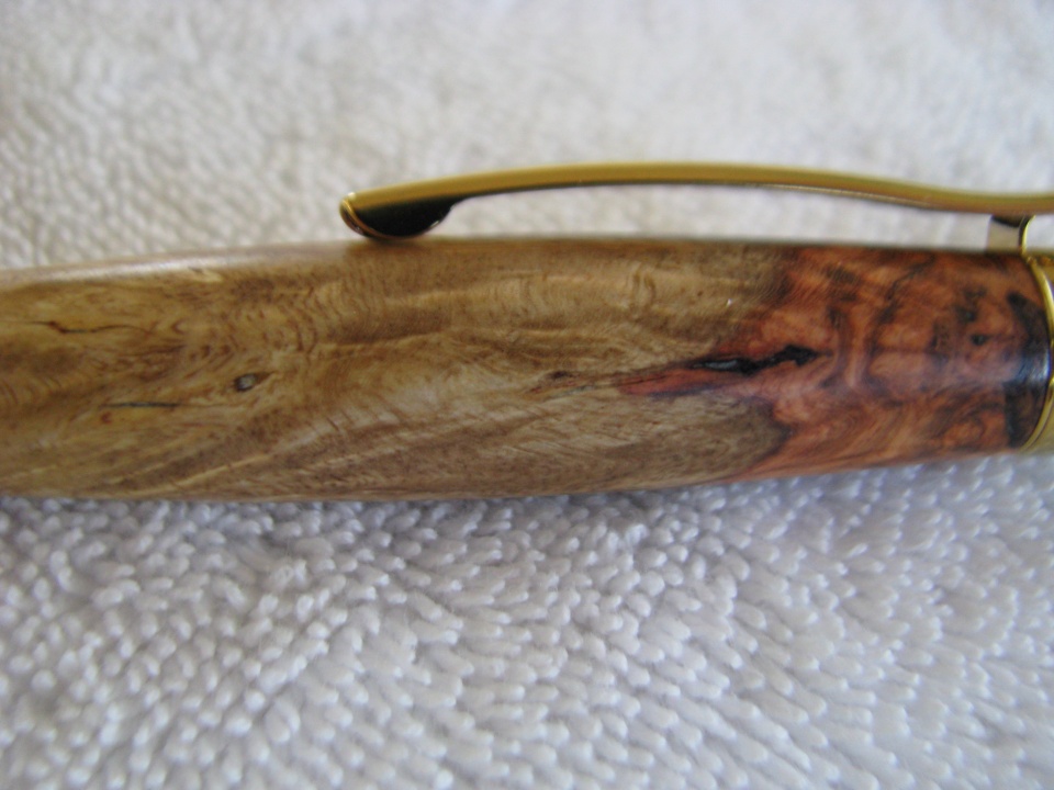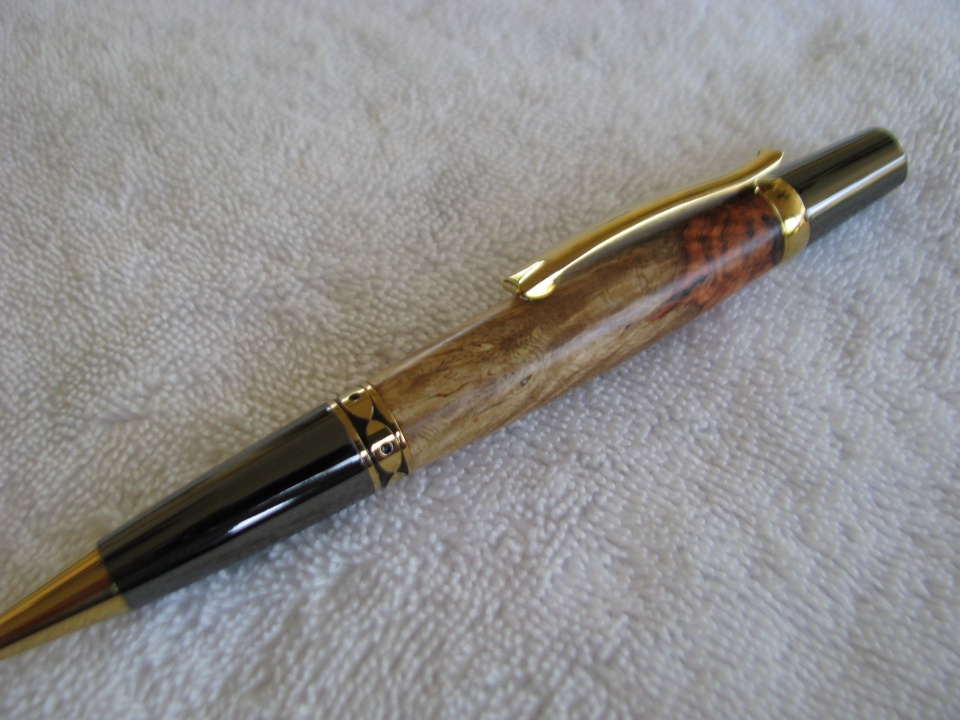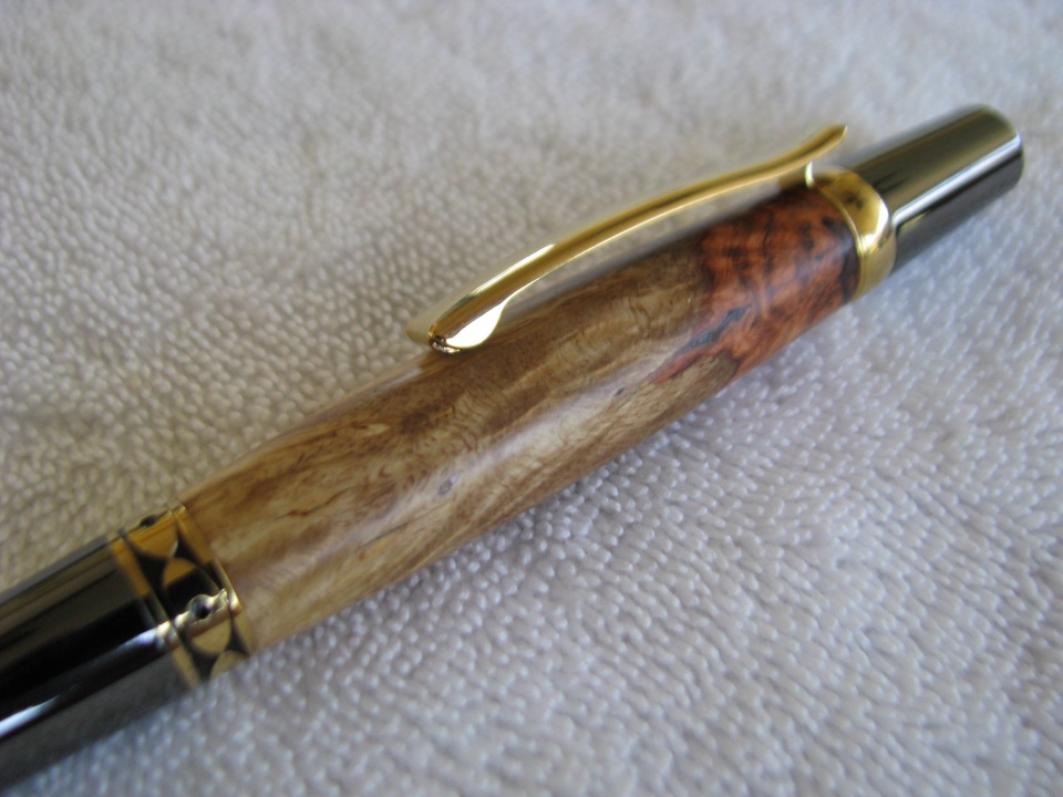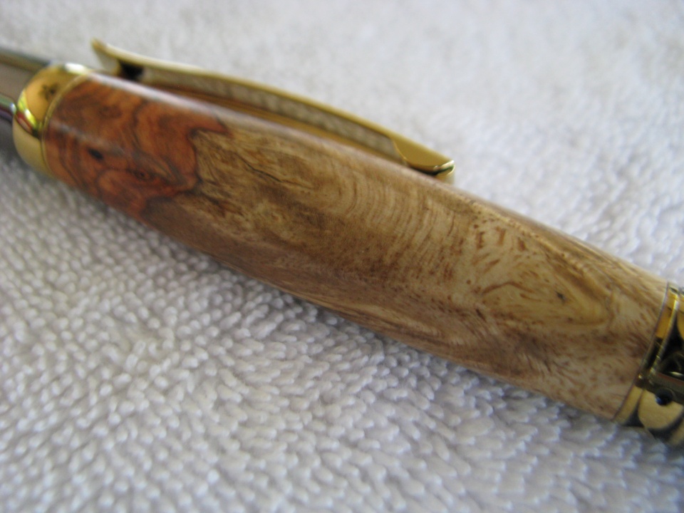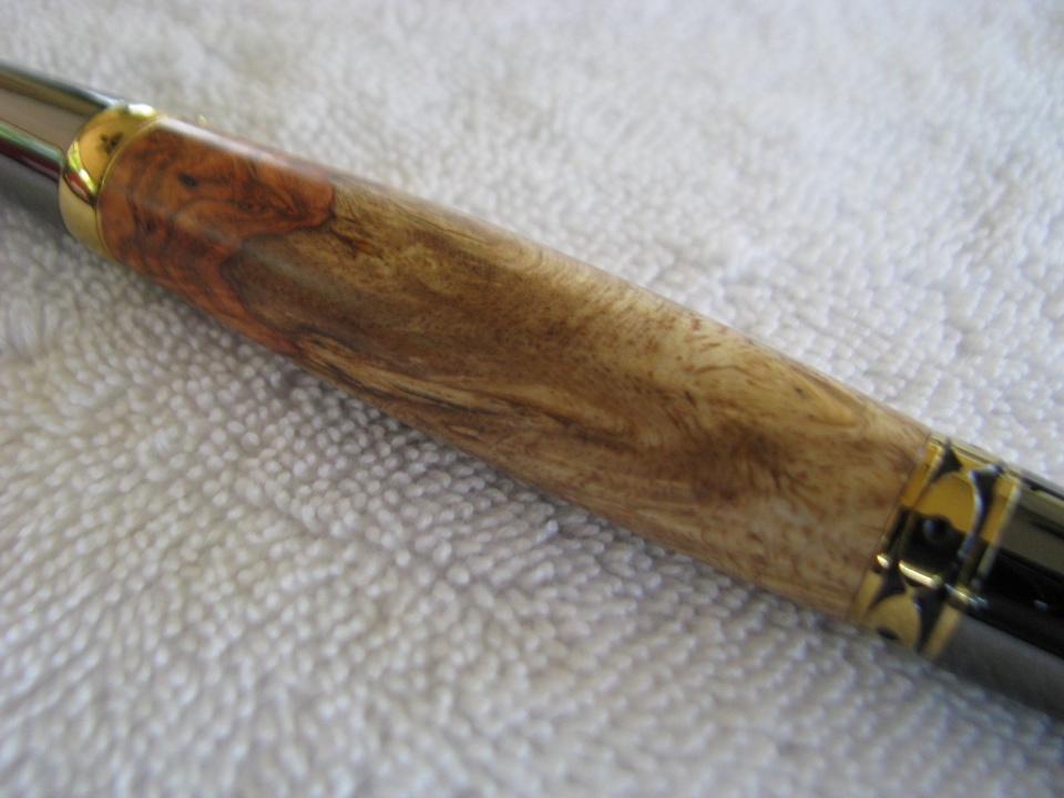 Last month Dogrunner (IAP screen name) offered a couple of SFR boxes of blanks for the shipping and I was lucky enough to receive one of them. This blank was in the box and I have no idea what kind of wood it is. I will say it was as hard as a rock and had a somewhat pungent smell when turned. Not like camphor but kind of like that. Eucalyptus ???? The burl was very tight and did I say hard? I used a BLO/CA finish. Typically with this combination I get a high gloss finish. On this piece, the CA had a gloss until I lightly sanded and tried to polish it. Then I could only bring it back to a satin finish. I did not sand through the CA. I thought I did at first so I reapplied with the same results... twice! Weird.... I really like the pen and it is currently my carry pen. Thoughts, opinions, ideas .... all welcome.
