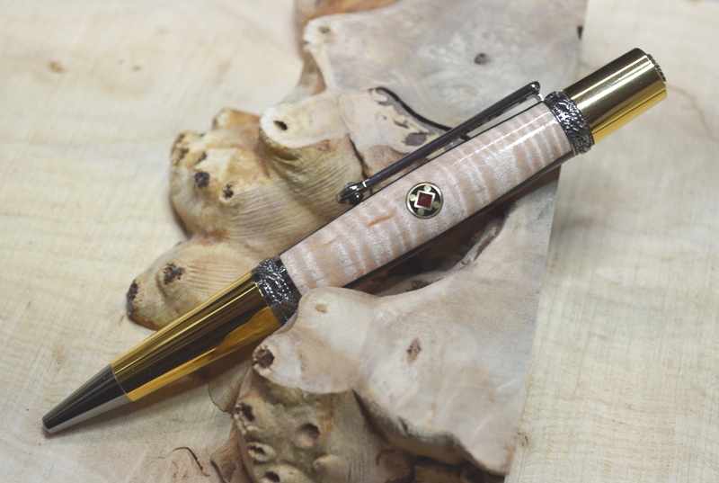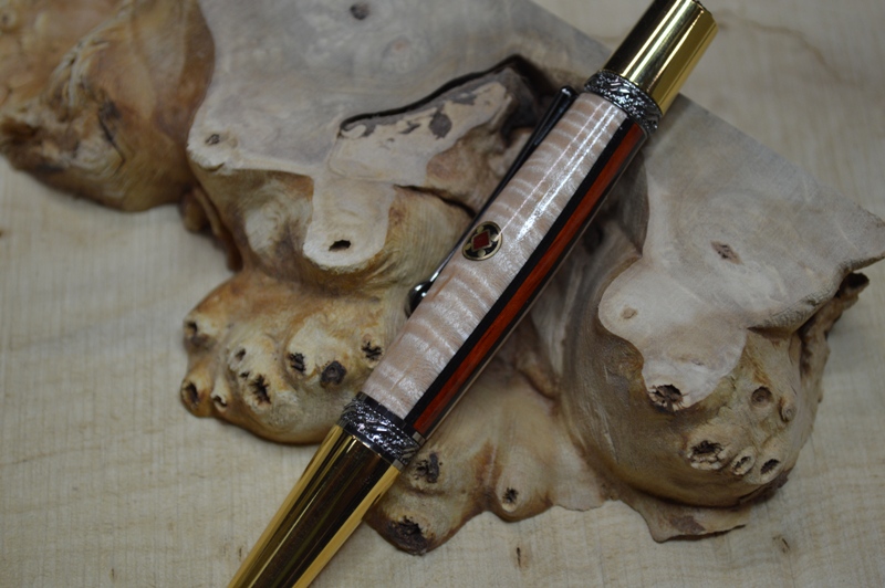 With the upcoming MPG I thought it would be nice to share a pen that has a mosaic in it. This is a Napoleon kit Black Ti / Rhodium. The wood is curly maple, paduk and dyed black pear veneer. The mosaic is brass tube and rod filled with black and red epoxy resin. Comments welcomed.