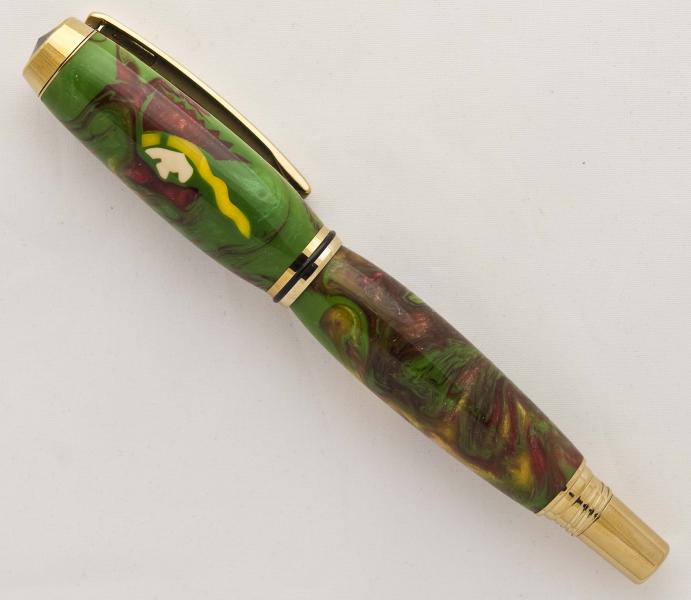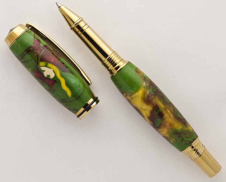 Made it this A.M. It's a beautiful Jeff Powell blank called Indian Chief that I got from Exotic Blanks. It is a mixture of green, gold, yellow and copper resin in iridescent swirls with the Chief in full traditional headdress. The headdress is a little harder to see with the copper swirls nearby. It's on Ti Gold Jr. Gentleman Rollerball. Fun to make. Comments welcome but most of all thanks for just looking. Doc