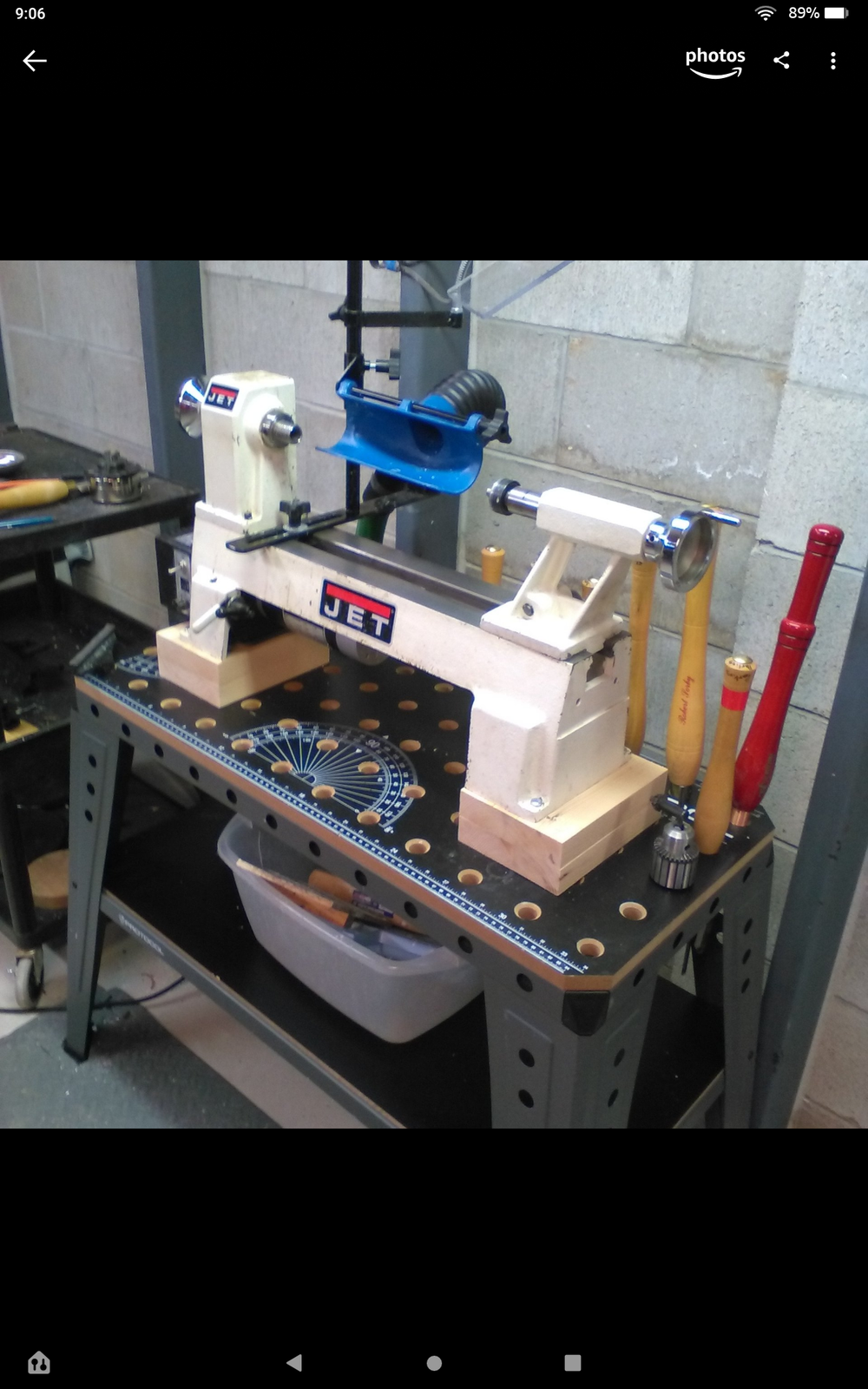 I used the base from an old gas grill. The top is made from 2x6 construction pine - trimmed to produce square corners, and then edge-glued to form a solid piece. When I upgraded to a new lathe, I found that the space between the bottom of the bedways and the top of the base was too small to be conveniently be able to keep that area clean of dust and shavings, so I added two scraps of 2x4 pine at 90deg to the 2x6 under the headstock and tailstock feet - that elevated the lathe a further 1.5 inches and provided the desired additional clearance.