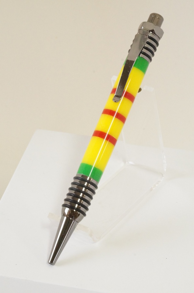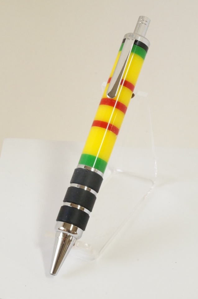 I was at my local wworking dealer (Johnsons Workbench, Charlotte, MI)couple weeks ago. One of my fav store emps knows I do pens. He does, too and shows me this pen he made for his dad. Blew me away. It was wood (yellow, green and red) and segmented to look like the ribbon Vietnam vets earned. Real nice.