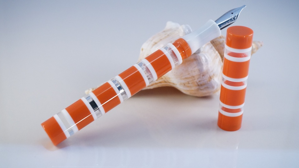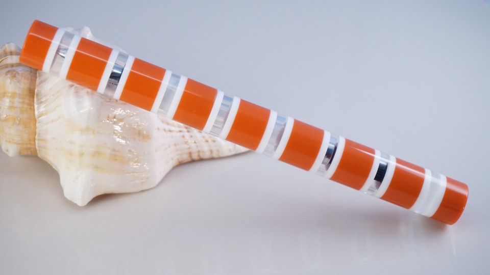This kitless pen is a style I have been calling Andromeda and has been done from a segmented Hoops and Loops Lucite material from Exotic.