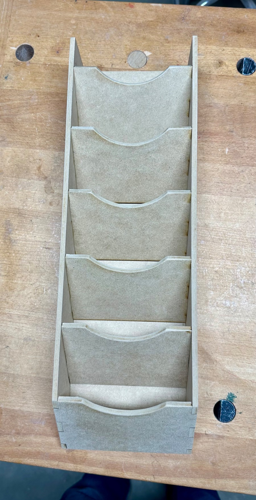 I drew up this sanding disc organizer and cut it on our laser out of 1/4 mdf. No more hunting down differing grits. Not fine woodworking, but very useful. I like how it turned out.