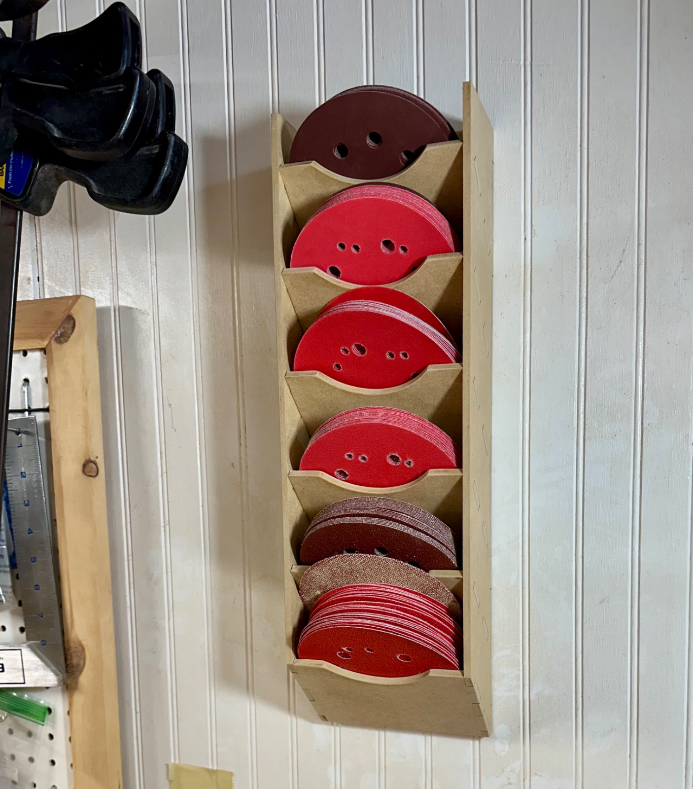 KenB259 Member Joined Dec 24, 2017 Messages 4,430 Location Michigan Today at 1:50 PM #1 I drew up this sanding disc organizer and cut it on our laser out of 1/4 mdf. No more hunting down differing grits. Not fine woodworking, but very useful. I like how it turned out. Attachments IMG_6294.jpeg 497.1 KB · Views: 30 IMG_6295.jpeg 387.6 KB · Views: 29 IMG_6296.jpeg 579.9 KB · Views: 29