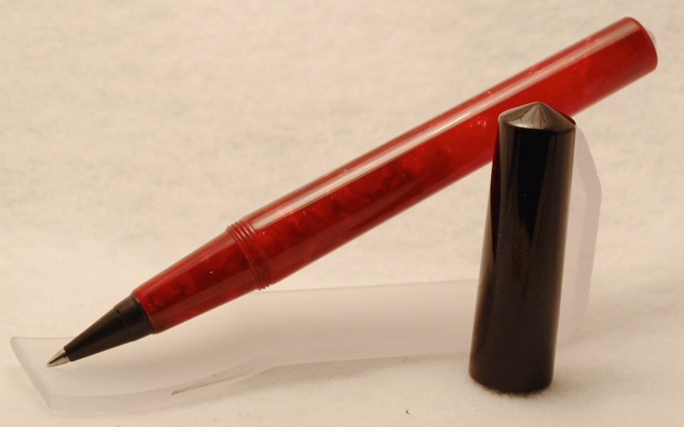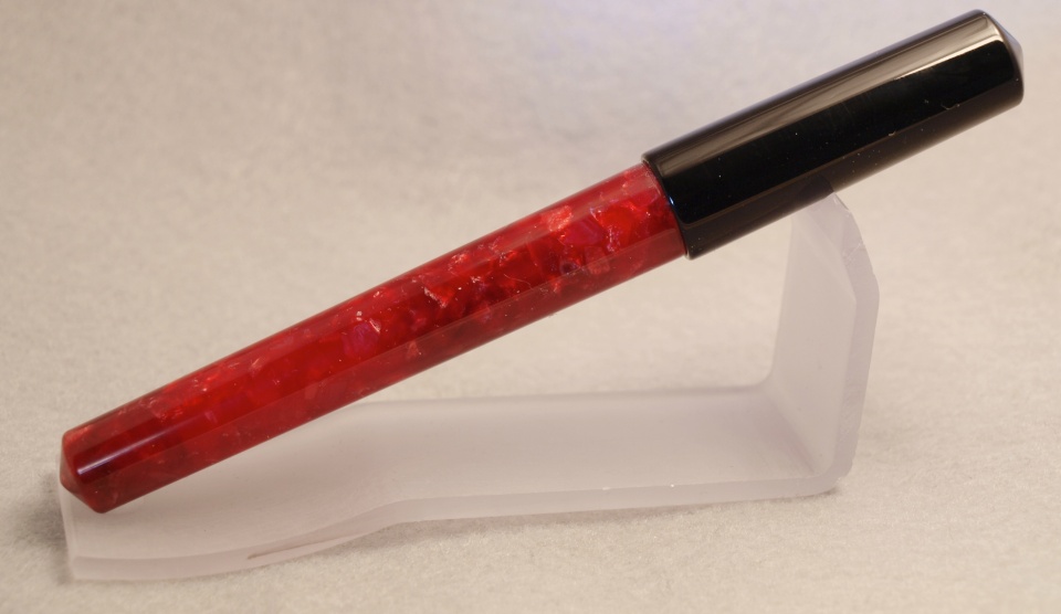 This is a redo of a pen I made previously. It broke due to little or no clearance between inside and outside threads. I like this tapered design with closed ends better. I use red cartridges for mark ups at work. I messed up one thing, I made it too short to hold two cartridges. Overall, I'm quite pleased the design and construction.