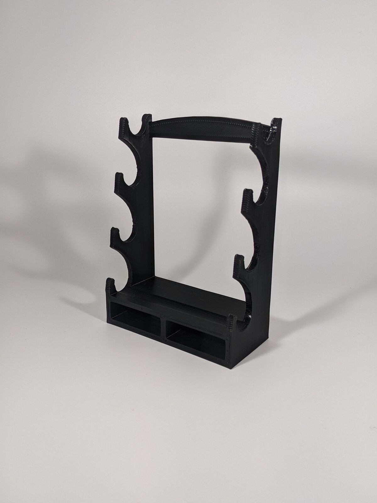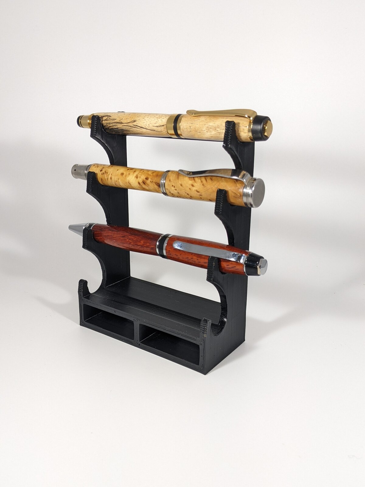 I have several of my Gun Rack Pen Stands available. These are the newest revision of the stand. I had a request to make the saddle diameter a little bigger to better accommodate larger Jr. series pens. After the revision the new stands are just slightly taller and a little deeper front to back. The increased size is irrelevant in terms of cost so these will still be $10 each plus shipping or a set of four for $45 shipped.