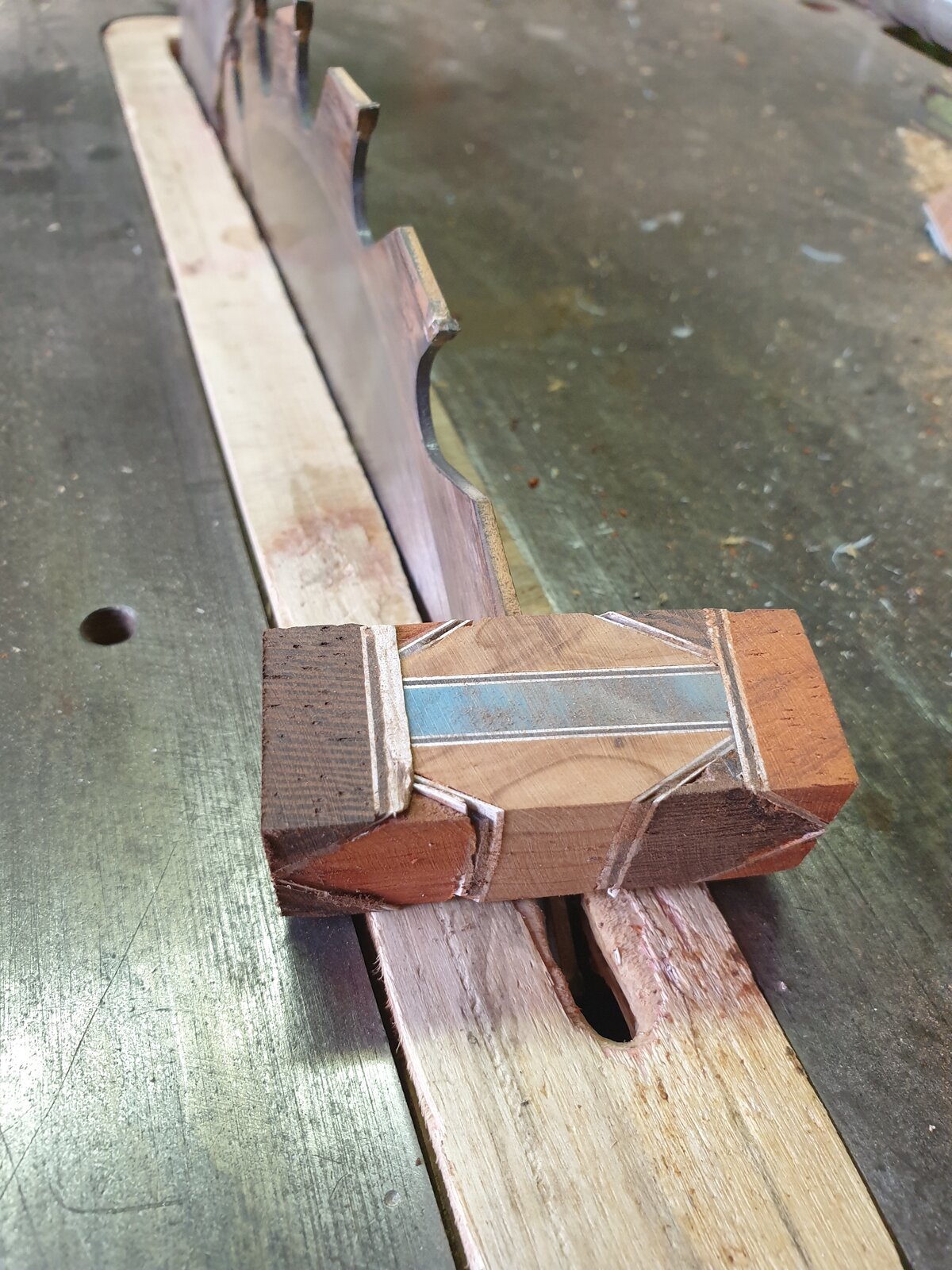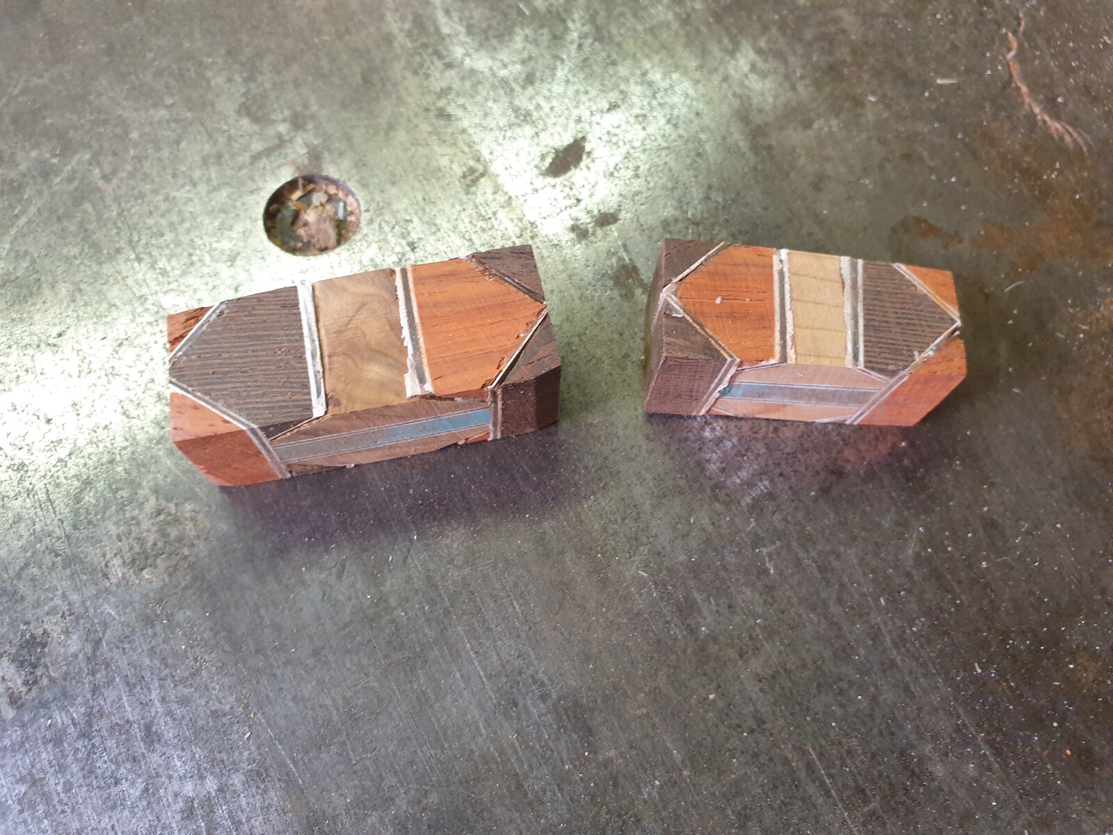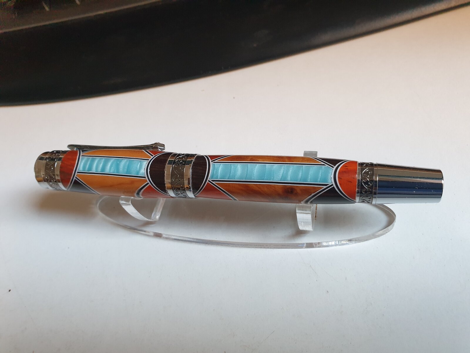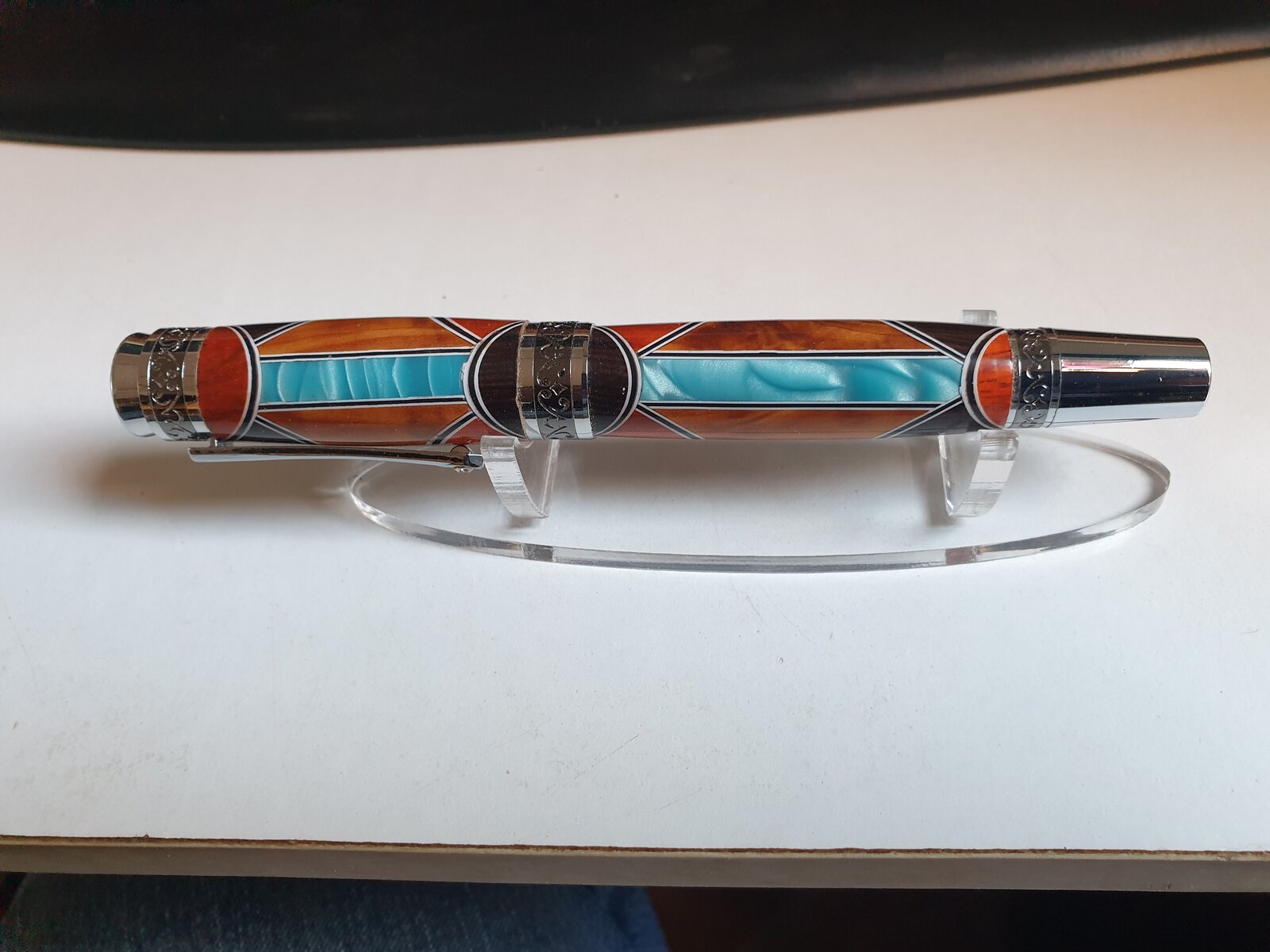 So i took the challenge and a new majestic rollerball penkit. The pictures show the making of the blank and the finished pen. I took the laguna dragon because of the color that my wife likes so much. Segmenting is my thing, so a decent number of cuts i made.