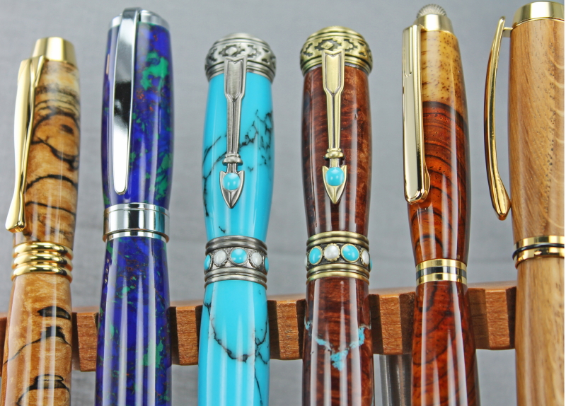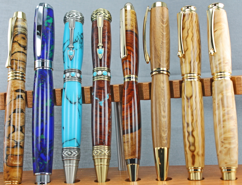 From left to right: Black Line Spalted Oak on Executive Rollerball, Blue Azurite/Malachite Tru-Stone on Magnetic Rollerball, Persian Turquoise on Southwest Twist in Pewter, Manzanita burl, Inlaid with Turquoise on Southwest Twist in Antique Brass, Crosscut Two-Tone Cocobolo on Tetra Stylus Twist, Oak from HMS Victory (this piece had the original paint on it, which means it was taken from the officers quarters) on Jr. Gent Gold Twist, Olive Wood from Jerusalem on Gold Virage Rollerball, Himalayan Spruce Burl on Gold Virage Rollerball.