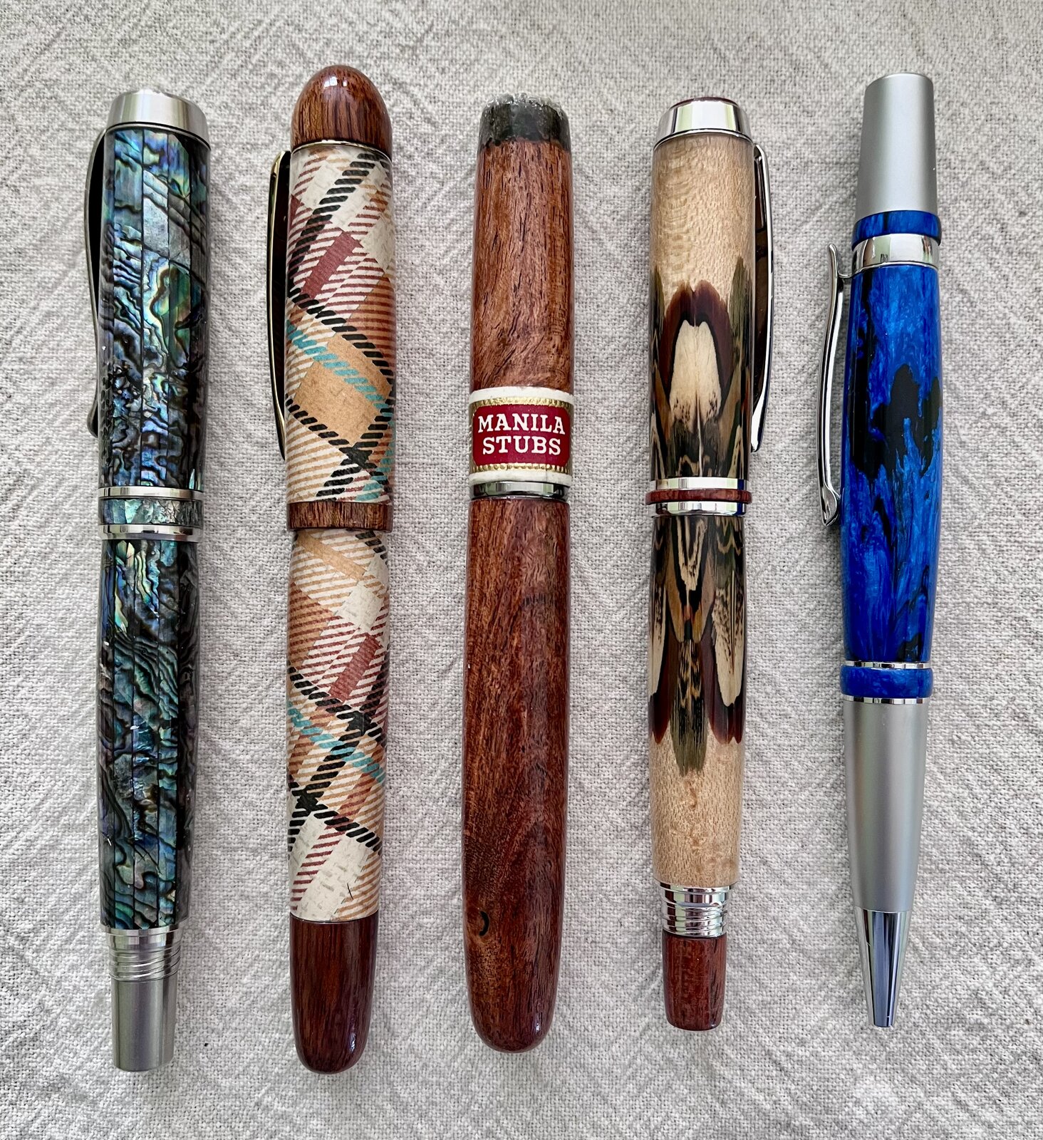 This group began as a request from Ed at Exotic blanks. I was invited to participate in a live "Zoom" demo that Exotic Blanks presents every month on line for free. Last Thursday's topic was kitless and custom alterations in pen making. It's always a great time visiting and hanging out with Ed and Dawn Exotic Blanks. These are my contributions...