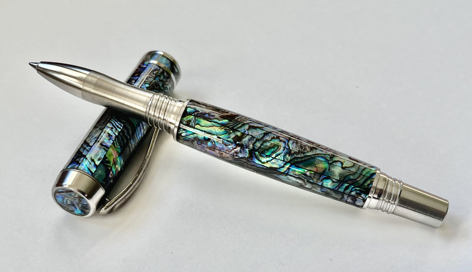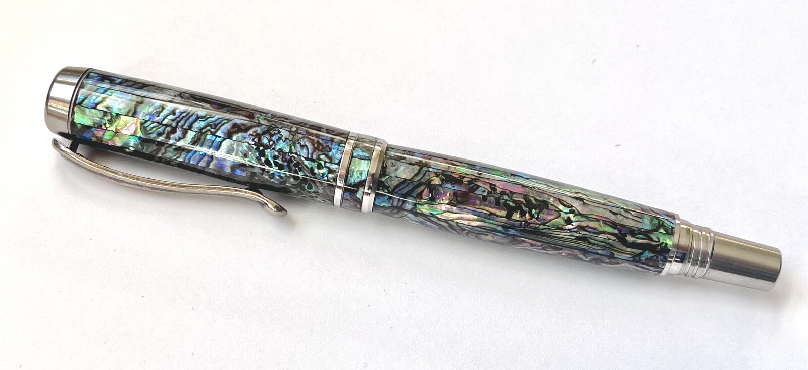 The first is a new pen component set at Exotic Blanks "not yet available". It's a stainless steel rollerball. Ed sent me a couple to play with prior to the demo. My first thought was Abalone will look great with that stainless steel color! I constructed a custom finial and center band along with the blank, abalone shell clear cast in silmar polyester resin. This will definitely be one of my "go to" component sets!