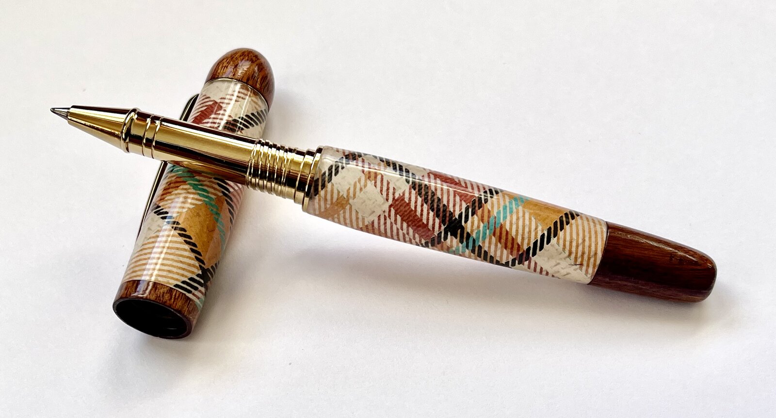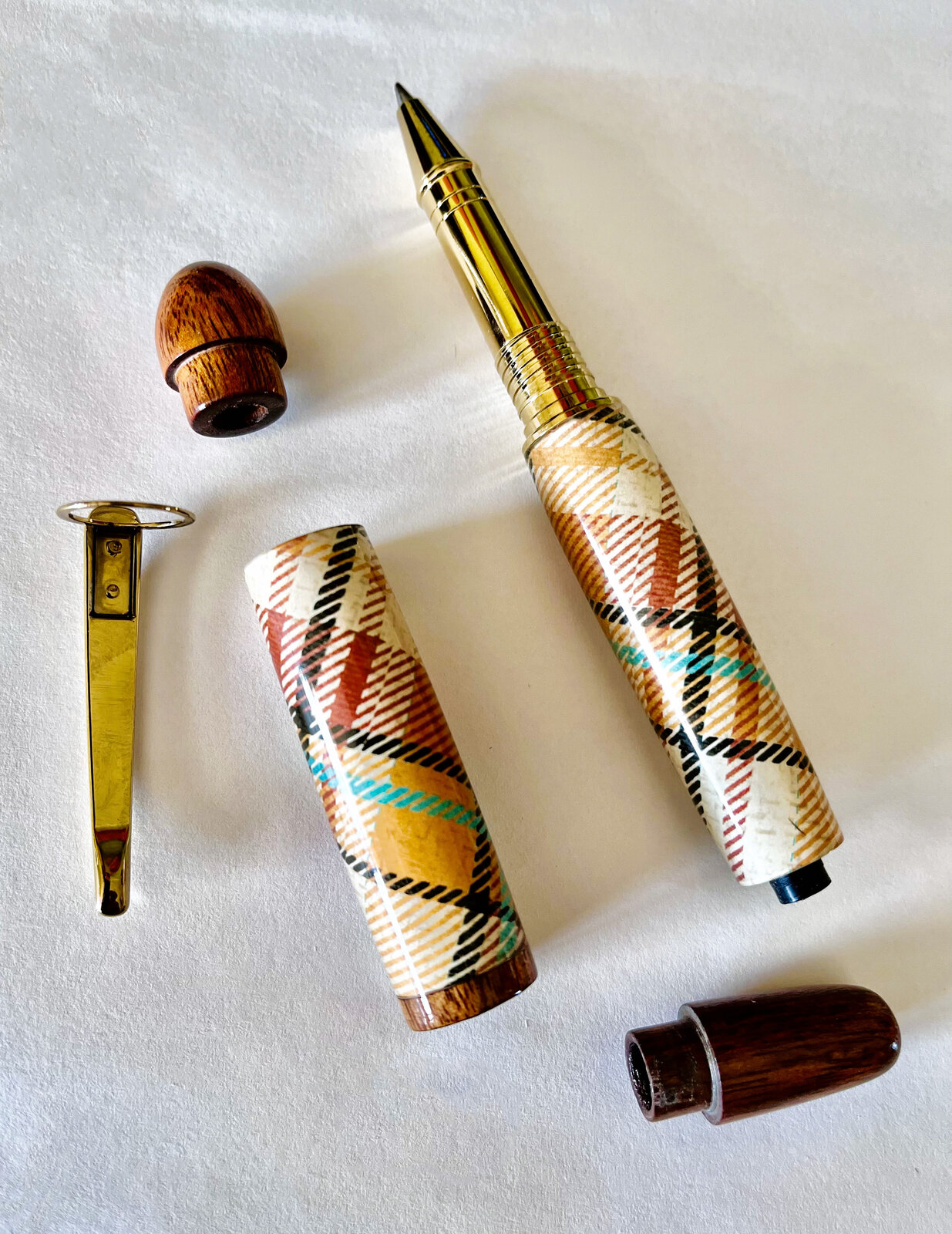 The third pen is a new "Tan Plaid" blank I'm making. I wanted to show how you could make "kitless or custom" pens from pretubed clear cast blanks. By using the original parts for internal measurements, I constructed new "Chechen wood" parts. Making tenons gave them strength and allowed me to keep the pieces in place. I left these pieces loose so I could disassemble the parts for the demo. If I were making a pen to use, I would have epoxied them all in place during the turning. I used the jr nib and threads in the cap.