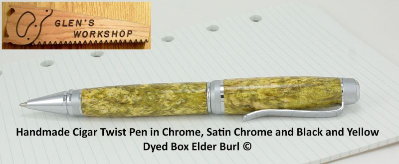 IMGP4679 GlensWorkshop Etsy Handmade Cigar Twist Pen Chrome Black Yellow Box Elder Burl 800.jpg