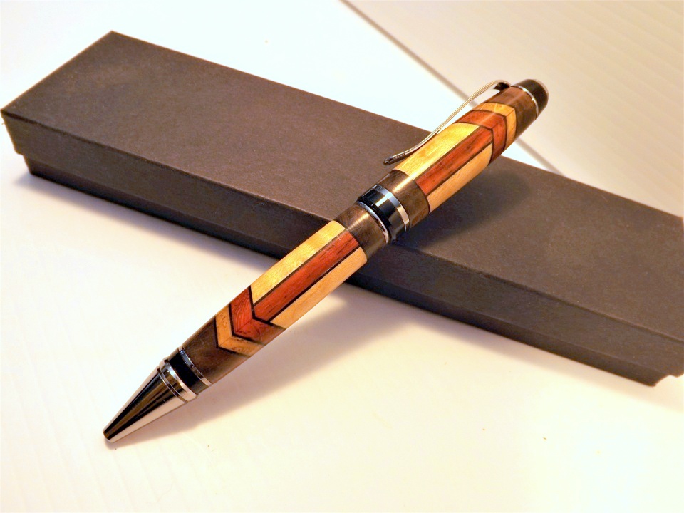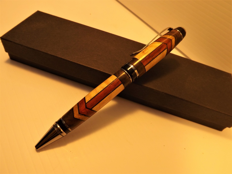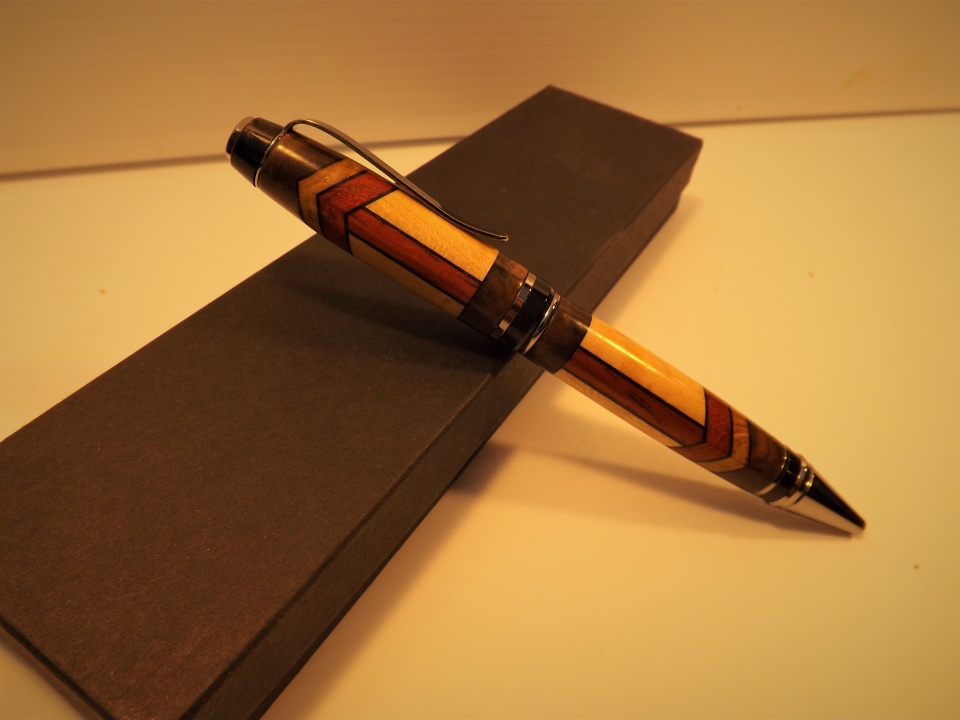 Playing with a Gisi(ish) style pen blank, started off simple enough made of walnut, white oak, padauk and maple. I didn't want to waste an expensive kit on an experiment, so built it on a simple cigar kit in titanium. I like the way it turned out and will do the other blanks I have left over on some better kits.