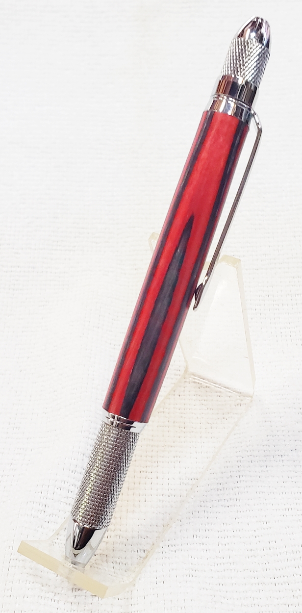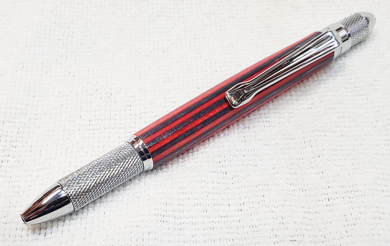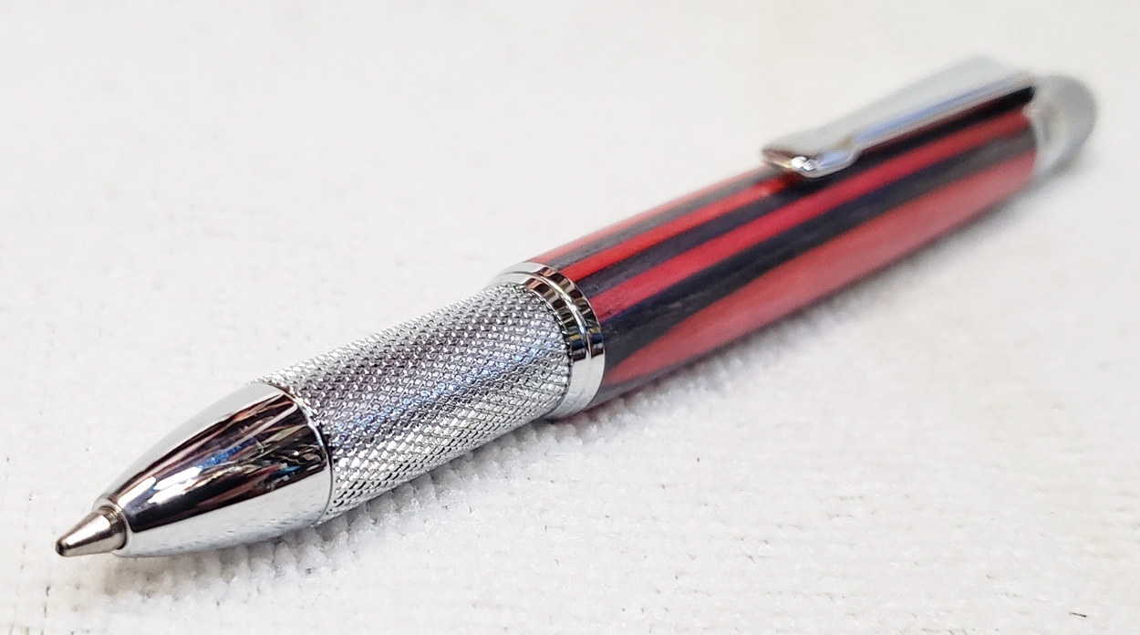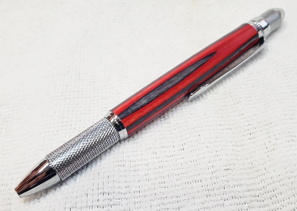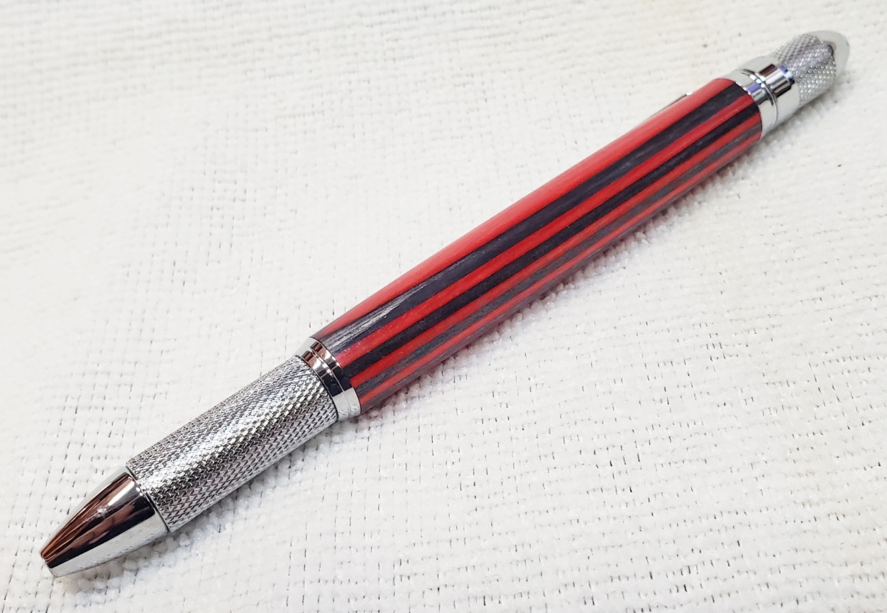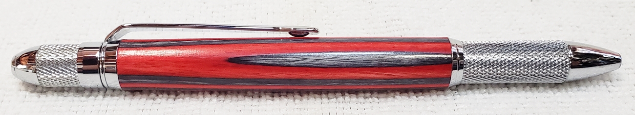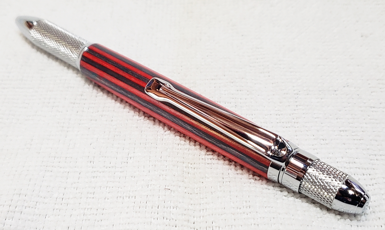 This is a new GT2 pen from PSI, in chrome. Not bad, but I think I like the looks of the old Knurl GT better. The blank is a SpectraPly from Woodcraft called Applejack. The finish is Mylands high build friction polish and carnuba wax.