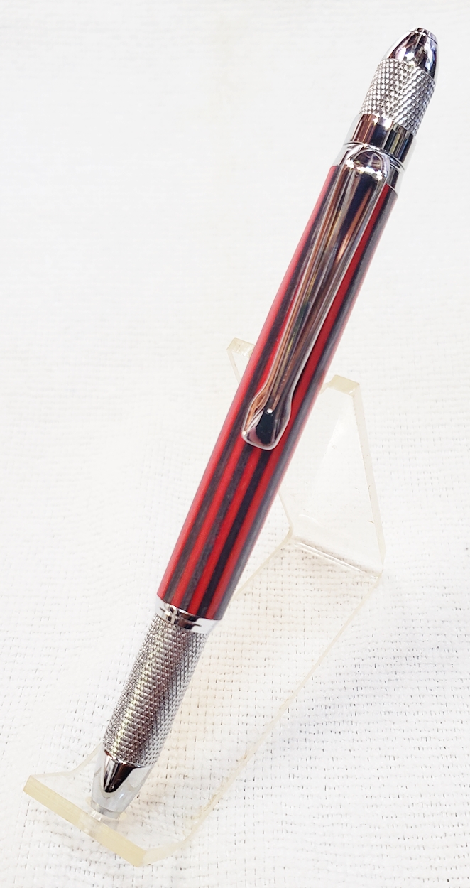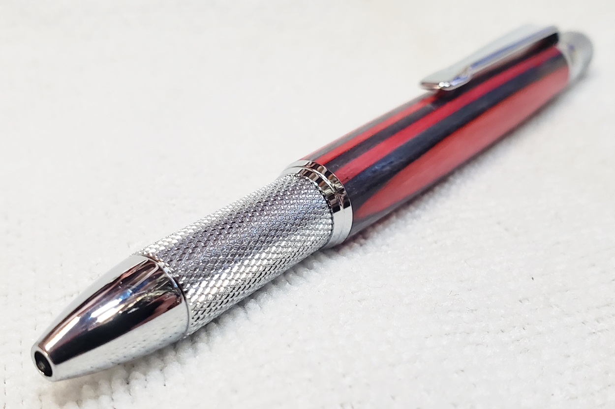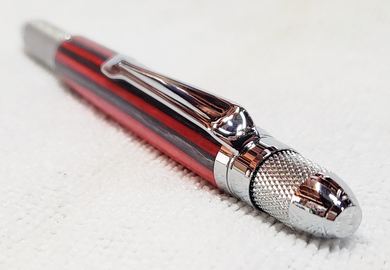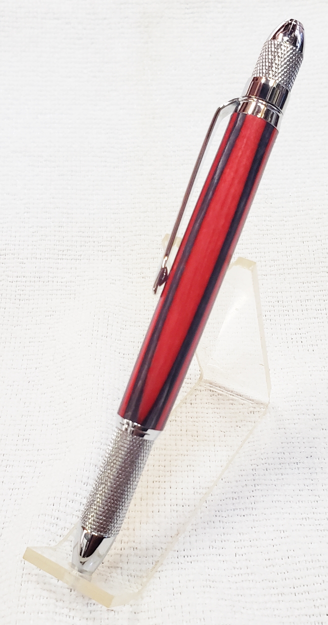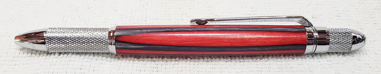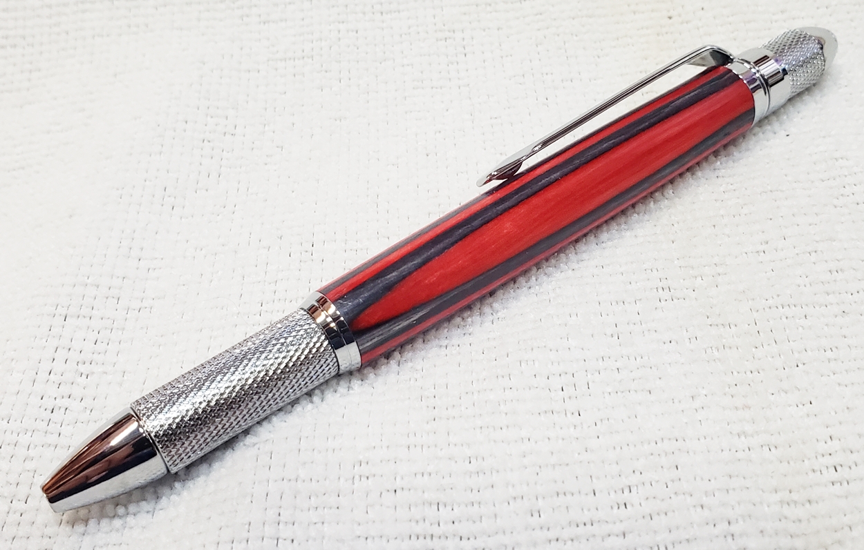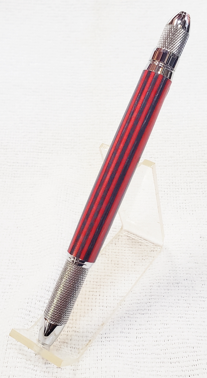 This is a new GT2 pen from PSI, in chrome. Not bad, but I think I like the looks of the old Knurl GT better. The blank is a SpectraPly from Woodcraft called Applejack. The finish is Mylands high build friction polish and carnuba wax.