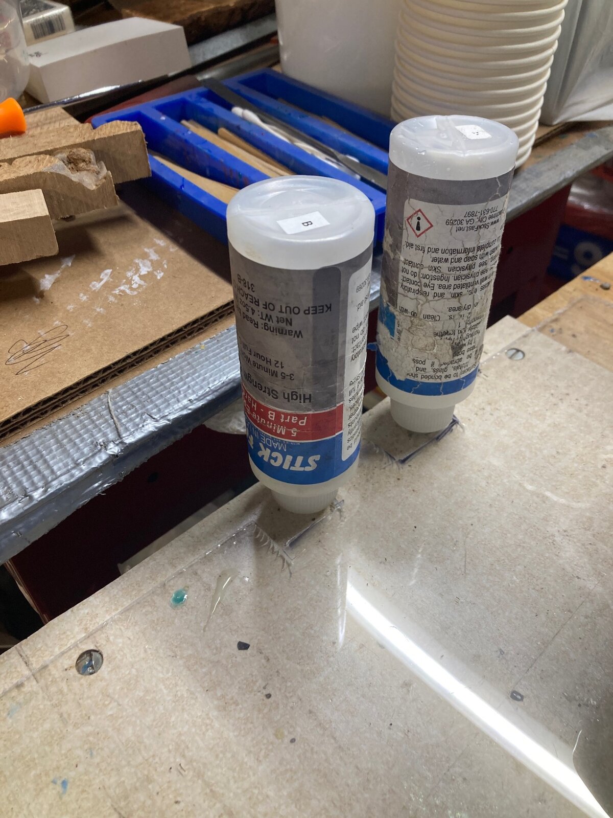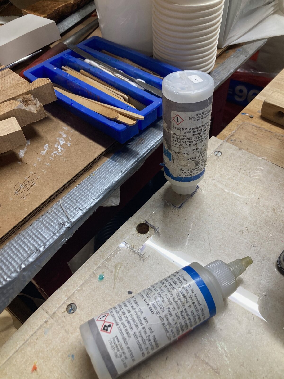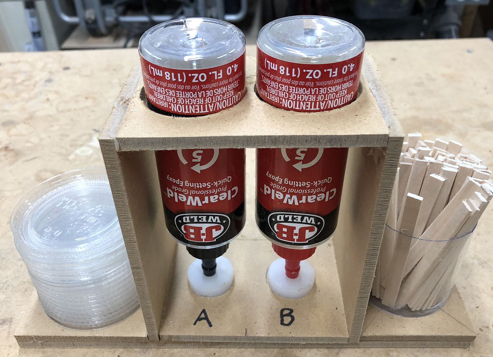 I use lids from small condiment cups to mix it on/in. I also turned a couple of HDPE buttons to rest the cap/tip in. I figured that leaks or drips would be less likely to glue themselves firmly to the HDPE than on wood. That way I can also pry them back out and clean them up with solvent if needed.