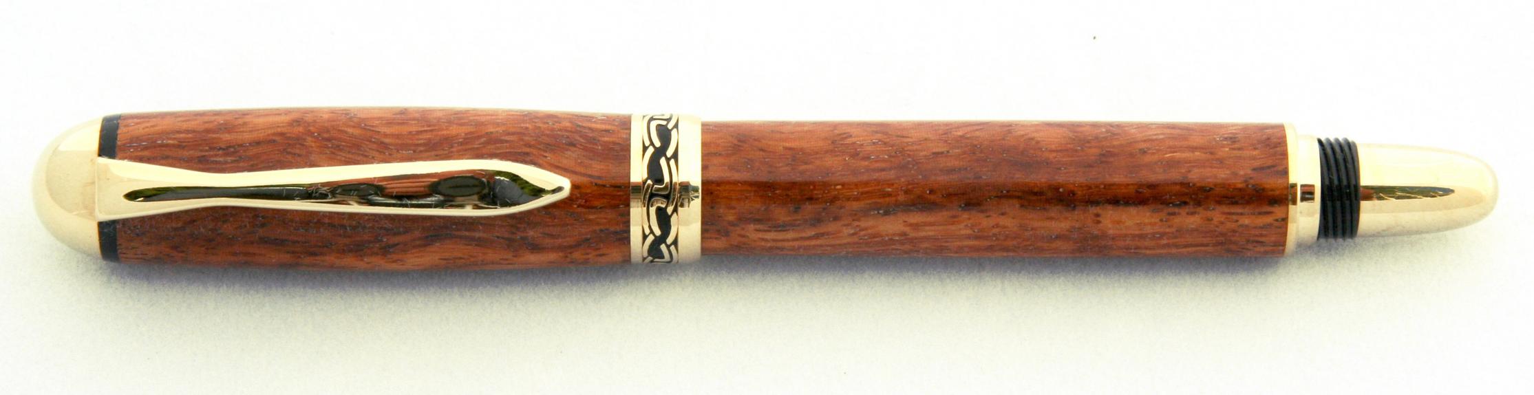 I learned the hard way with this pen that it is better to blow the dust off with compressed air during sanding than to use a rag. Using the rag, I permanently packed the dust into some of the open grain, which resulted in a few fine white lines... turn and learn.