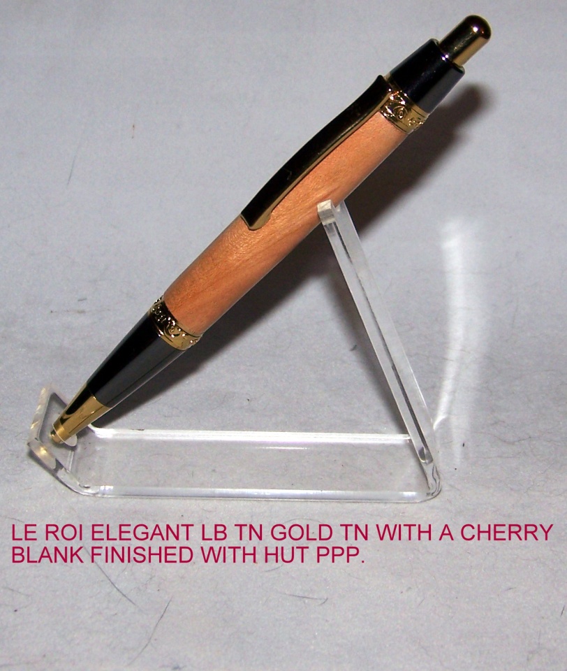 This is a pretty good example of why I like wood so much. I think it is a very pretty pen from a kind of mundane stick of wood and this time I did get my camera set a little better...the shadow is a little dark but it doesn't block the view of the pen. It is a Le Roi Elegant LB Click in Gold TN and the blank is a fairly nice but not spectacular Cherry...