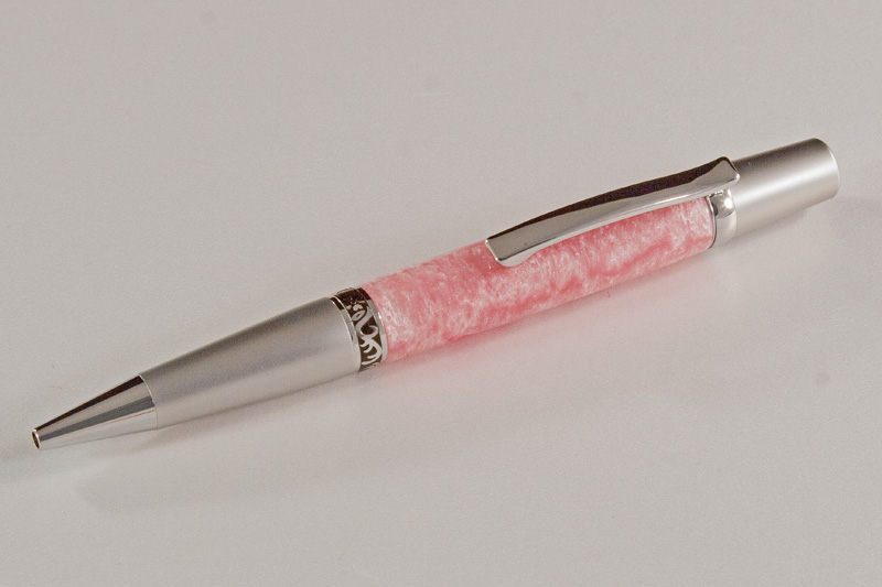 This is an Sierra in Chrome/Brushed that I did as a Breast Cancer Awareness pen. I had done a couple of the inlays and they sold well. I thought I would try something a little different. The blank is a home cast (my second) using a resin saver mold. After turning I applied decal, then coated with CA. I was going for a "ghost" ribbon. It's a little hard to see in the photos but the ribbon is transparent and the swirling in the pink body comes through the decal. It loos like it an inlaid acrylic more than a ribbon. I am very happy with the way this turned out.