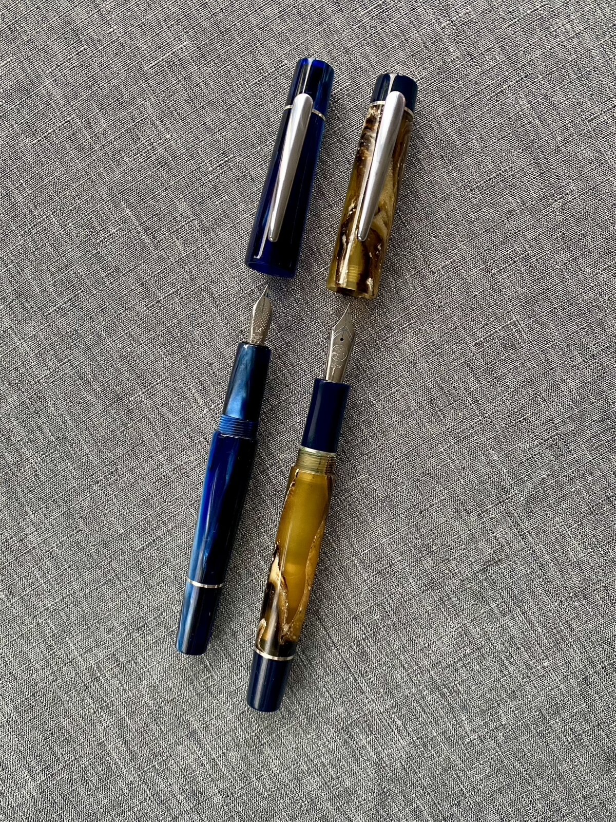 Beautiful work! I do prefer the shorter cap finial and the more rounded barrel on the Amber pen. That's just me. The distance from the top of the cap to the top of the clip on the blue pen seem a little extreme for my eyes. Not a criticism, simply an observation.