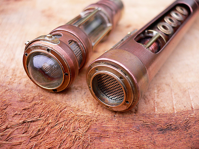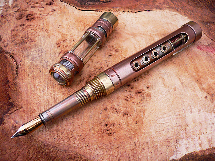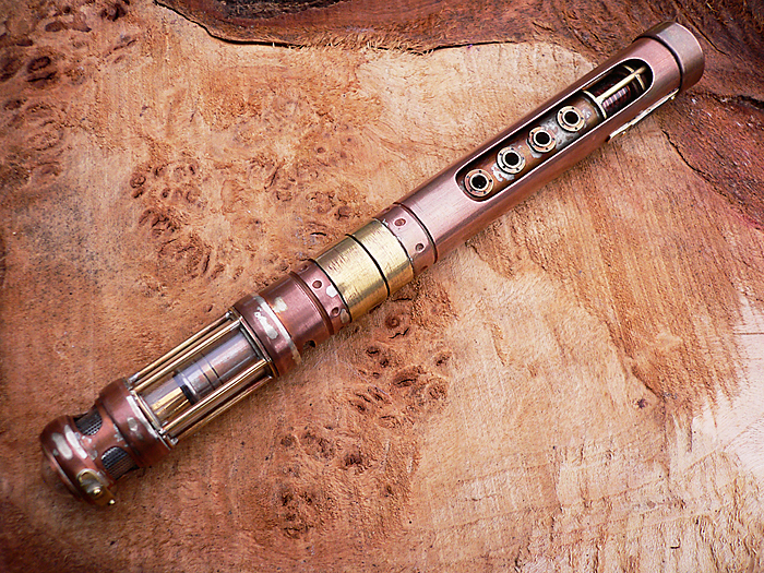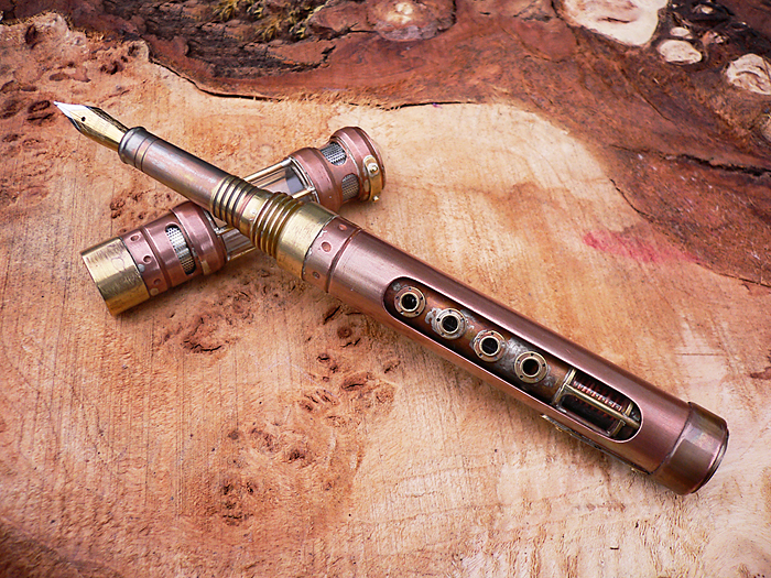 Based around a piece of 15mm copper tube it uses a modified compression fitting for the threads and a glass tube for the cap. Aged in my usual way, It's a little simpler in appearance to my previous pens but no less work to produce.