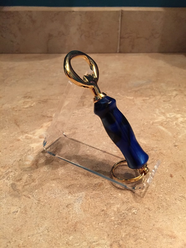Third is a bottle opener keychain I "created". Most of my friends carry a bottle opener on their keyrings, and I had never seen a kit sold, so I took the PSI bottle opener (since it is smaller) and paired it with a keychain kit, and presto! Blue and blask swirl blank finished with MM 12000 and HUT Ultra Gloss polish.