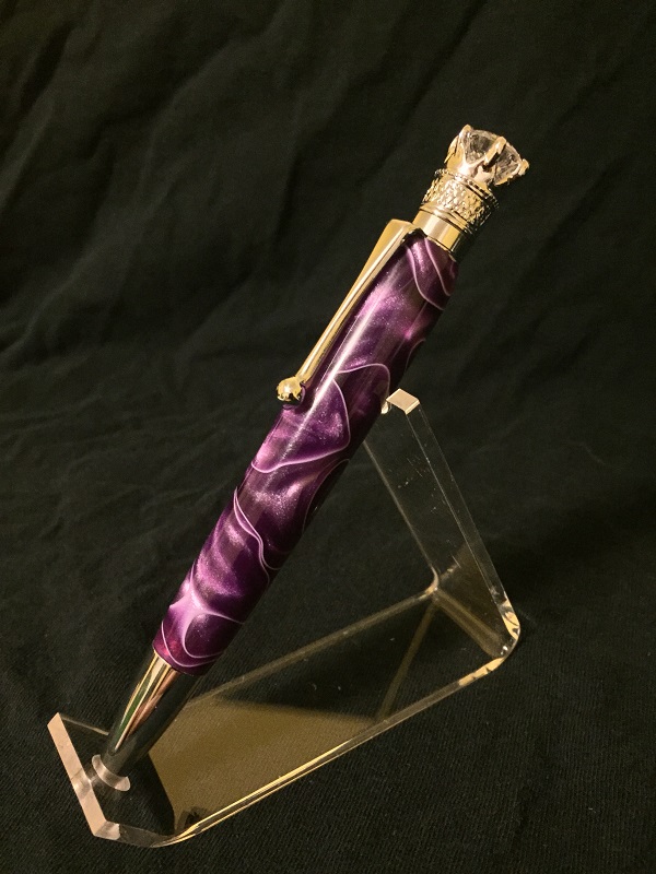 The first is a Crown Jewel pen in chrome from PSI with an older Purple acrylic blank. Finished with MM 12000 and HUT Ultra Gloss Polish.