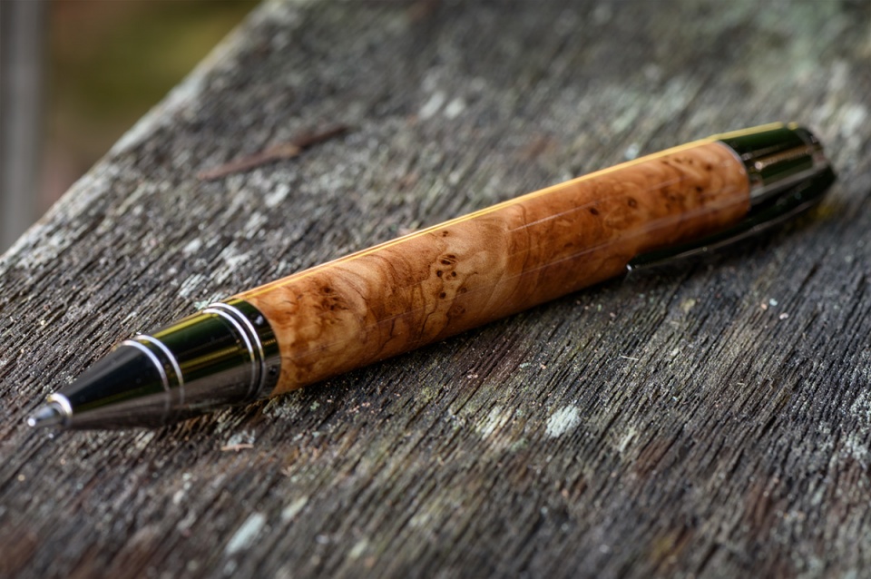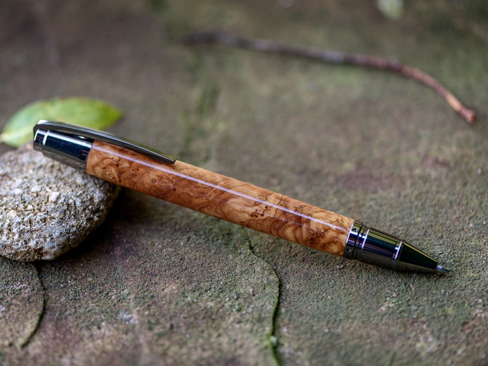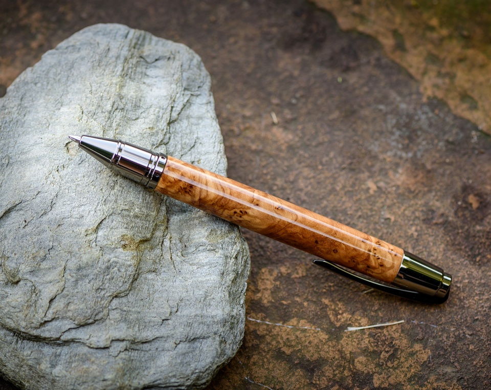 A great pen kit to show off nice looking wood. The accord is a very simple kit that is perfect for putting attention on the nice character of wood. This olive wood has been in the shop for a few years so I don't know who I purchased it from. It's a CA finish with plenty of sanding and buffing using the Beal buffing method. If you are looking for a kit that has a lot of beef to be able to do cast-on things (watch parts, stamps,...) this is a good kit for that. Thanks for looking.