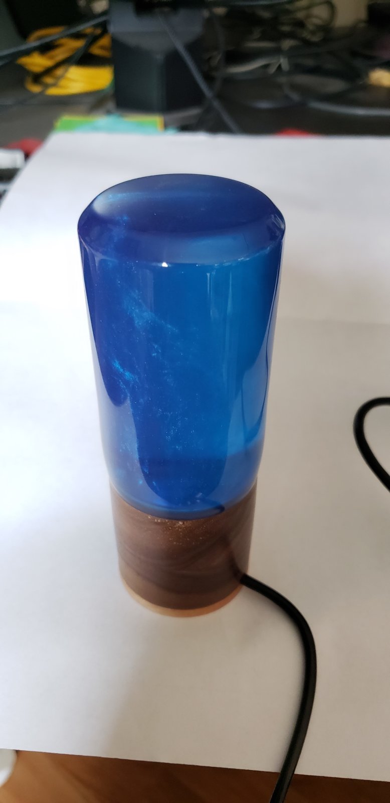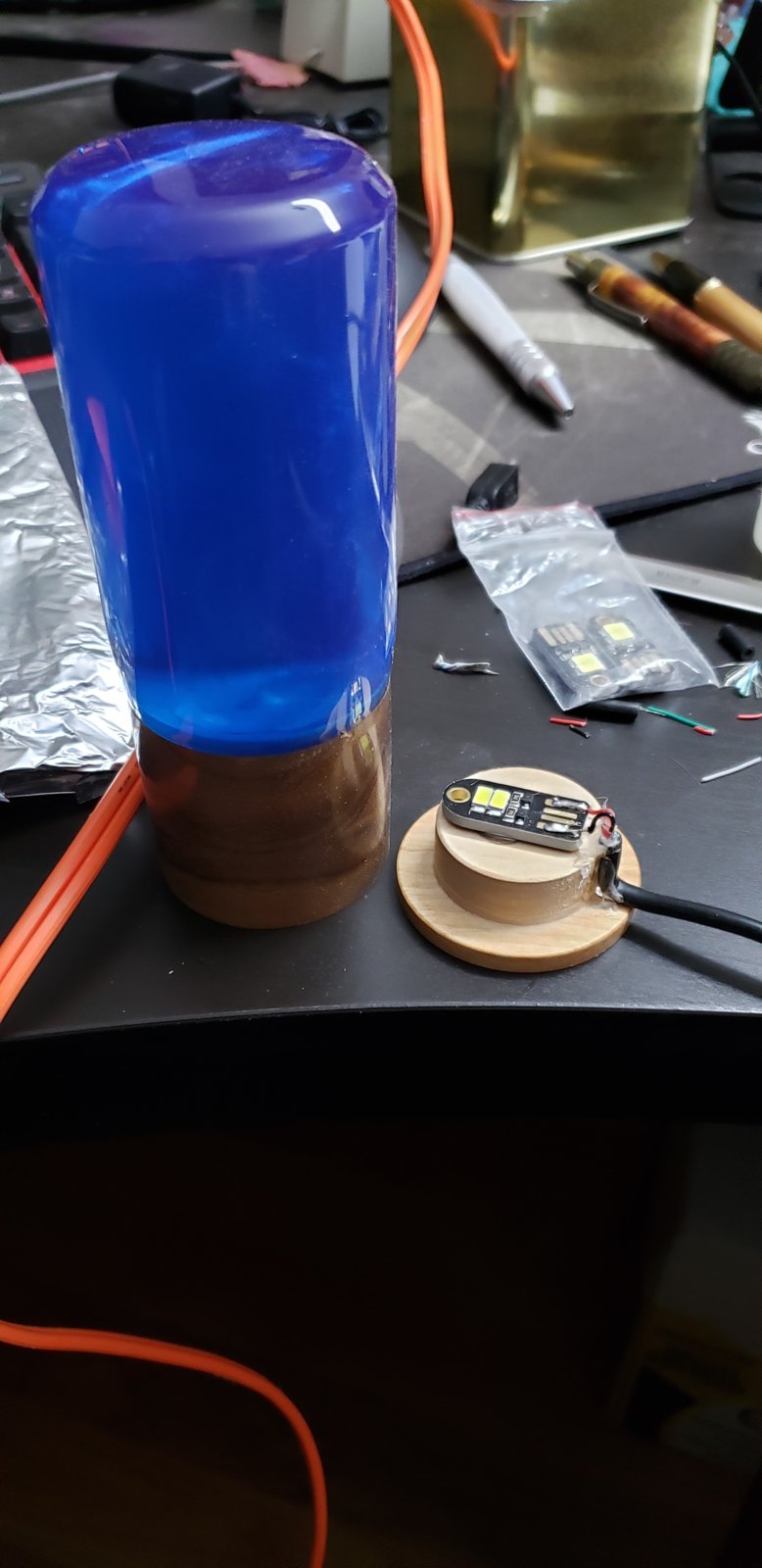 5. On that bottom cap I glue an LED light that I wire to a USB chord that cut one end off of and solder to the LED