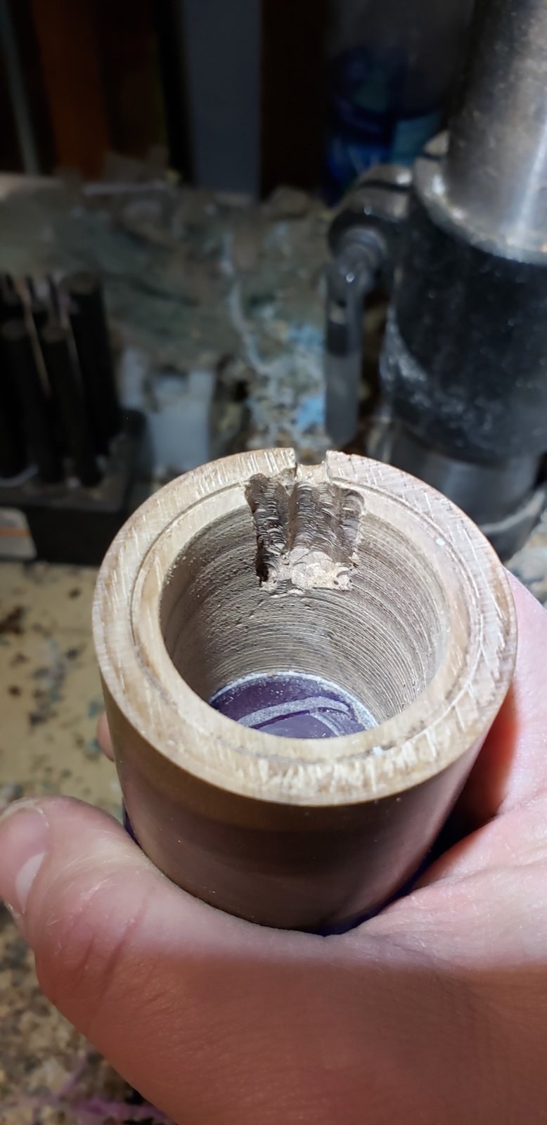 3. Pull the cast out, drill out the base until you hit the resin. I use spigot jaws in the drilled out base and turn the outside to the size/shape I want.