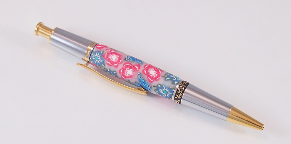 I figured out why my canes were turning brown, I was not preheating my toaster oven before putting in the blank. The heat was spiking during preheating and burning my canes. Aero click with pink and blue flowers and a couple of butterflies.