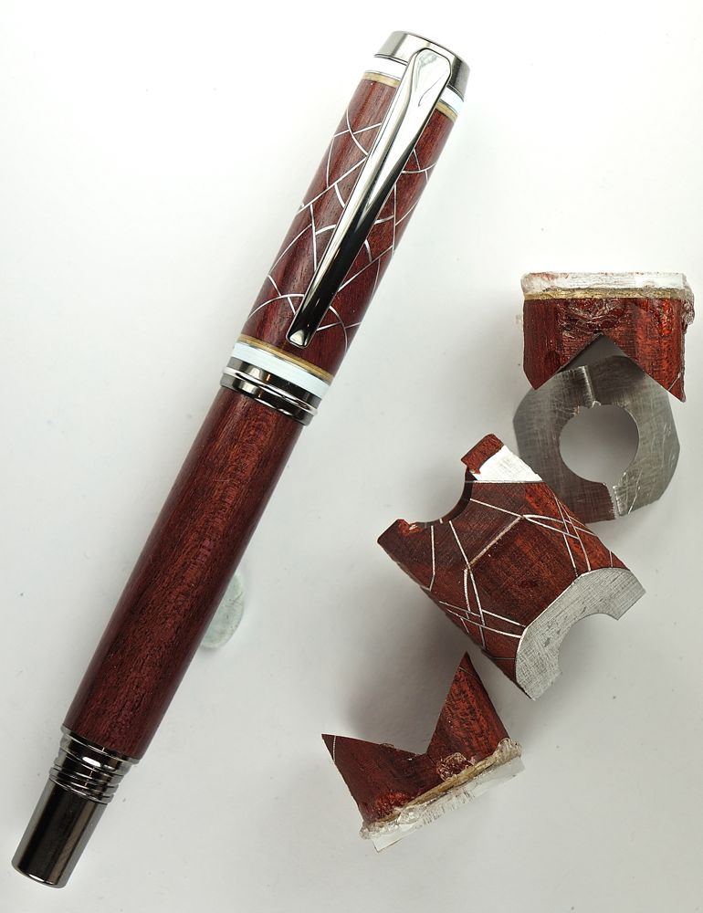 This is a pen my wife wanted me to make for her. She picked out the fittings and blank, I added the segmenting. The blank is a Wildwood with perforated ribbon added into the casting. The pen is a Navigator from Woodcraft with Gold and Black trim. I cut the blank in half lenghtwise, than added a 3-ply WBW pick guard. Next I turned the blank 90 degrees, cut in half again, and added another BWB pic guard. I cut off two sections of blank 1/4 inch wide, turned them 45 degrees, and added 6 white pick guard spacers in between. Turned to size , sanded to 12000, and added a coat of One Step polish. I had to promice on my death bed that I would return it to her purse as soon as I took the photos. I think she likes it, how about you?? Jim S