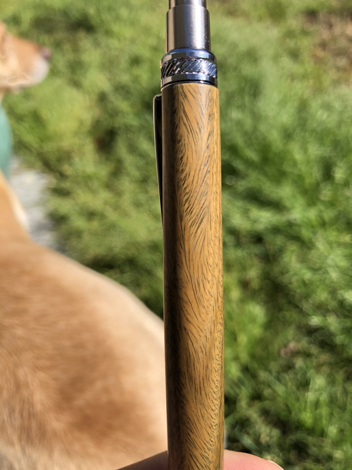 I have been carrying this one for a few months. It is Lignum Vitae with a Blade kit. No finish just sanded to 3k. I love the way it smells and the way the wood feels.