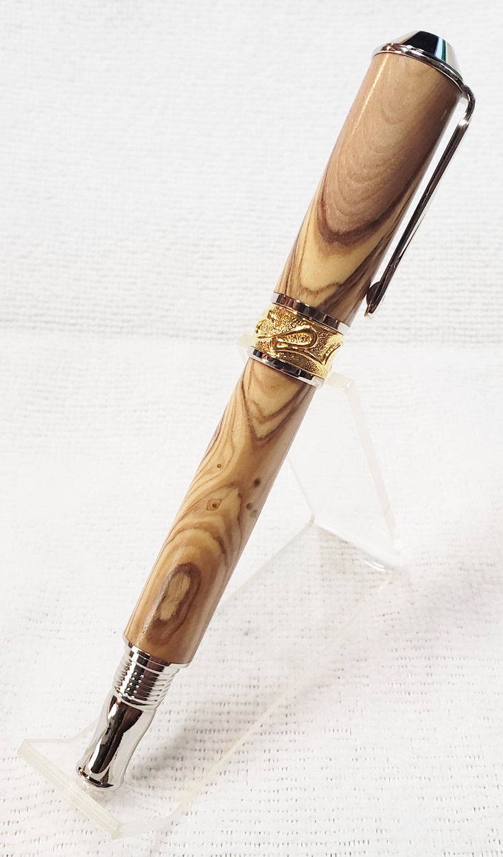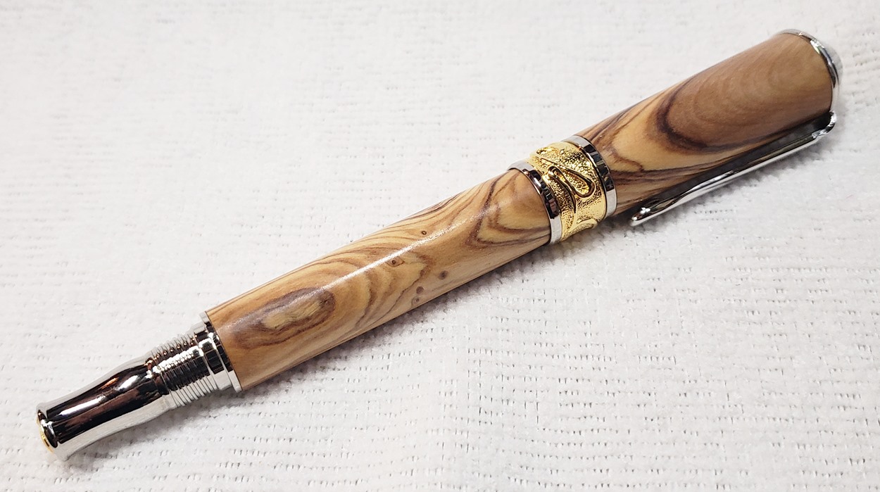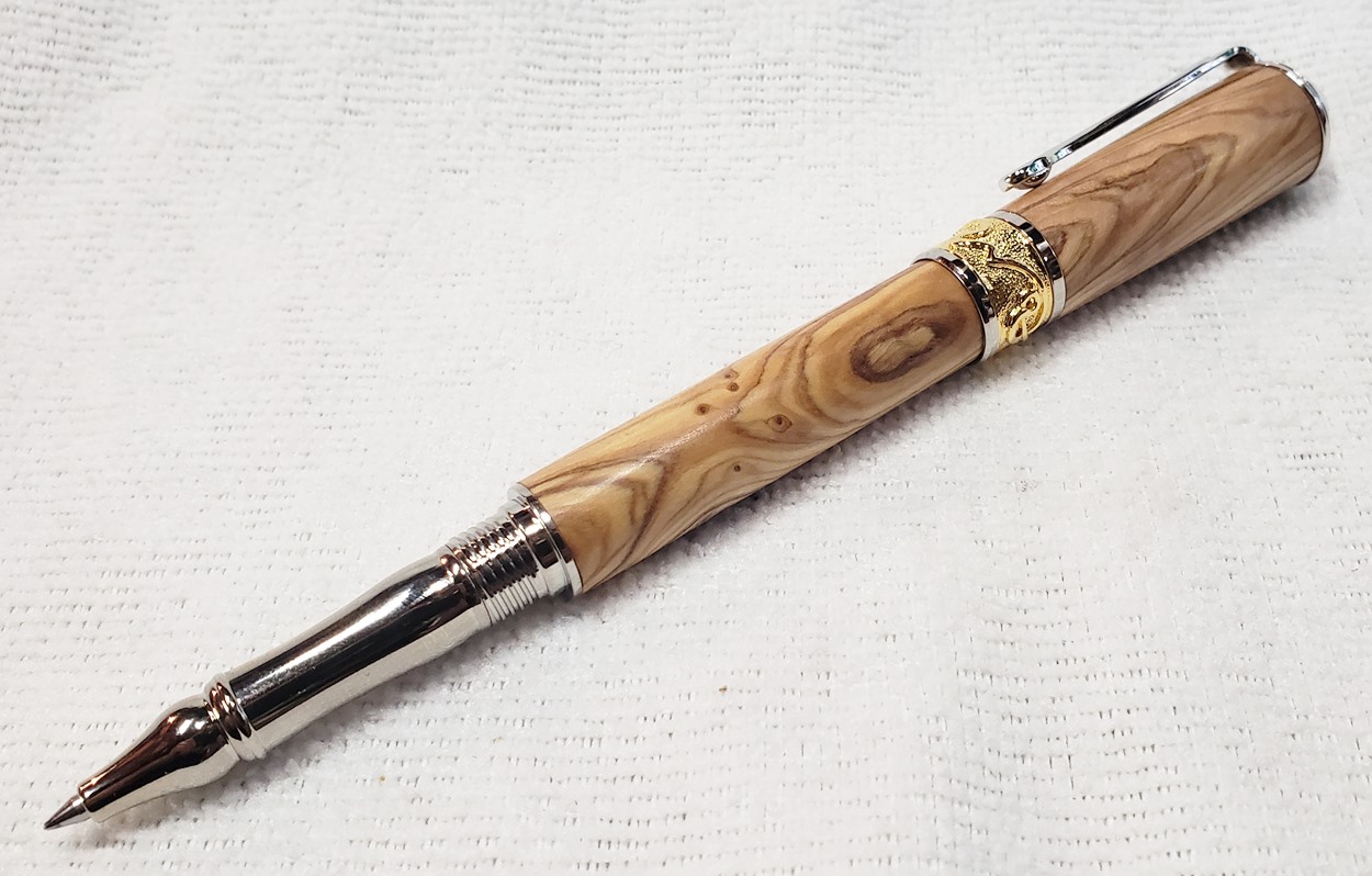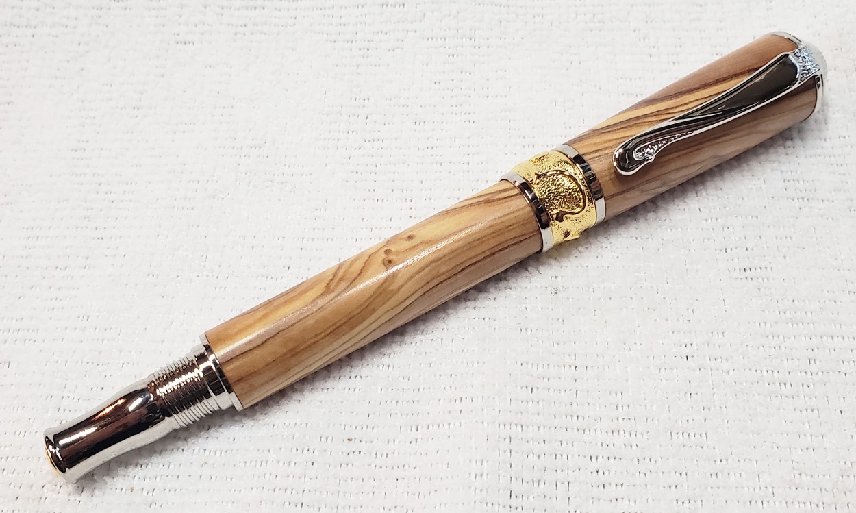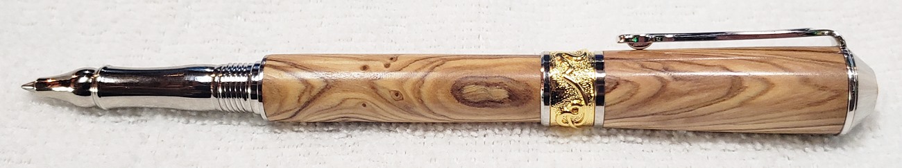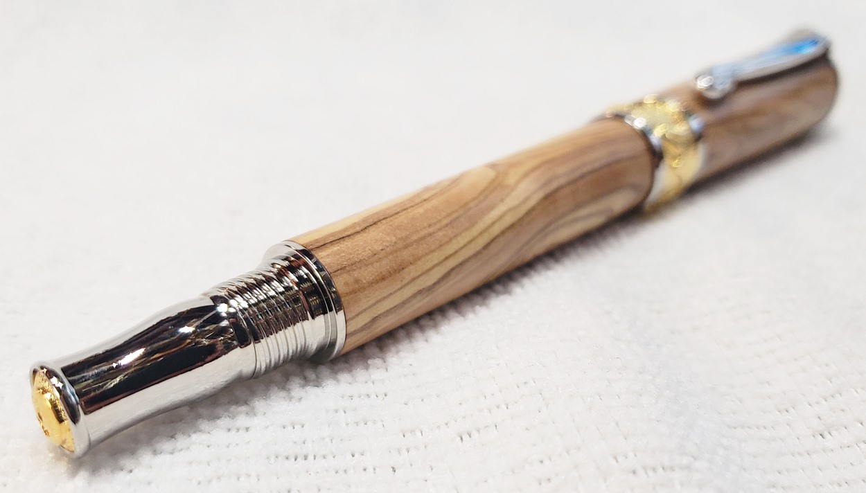 This is a PSI Nouveau Sceptre rollerball in rhodium and gold, that I purchased from Exotic Blanks. The blank is Bethlehem olivewood. I think it pairs well with the kit. The finish is Pens Plus.