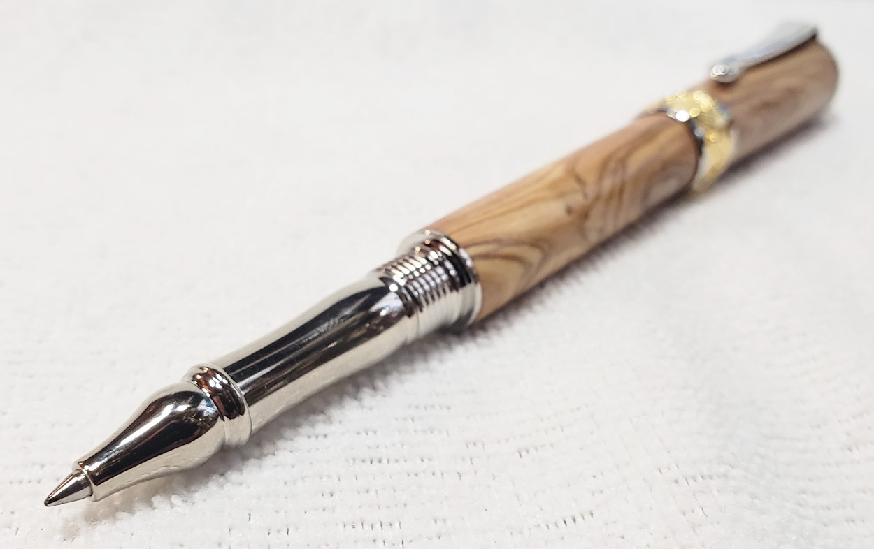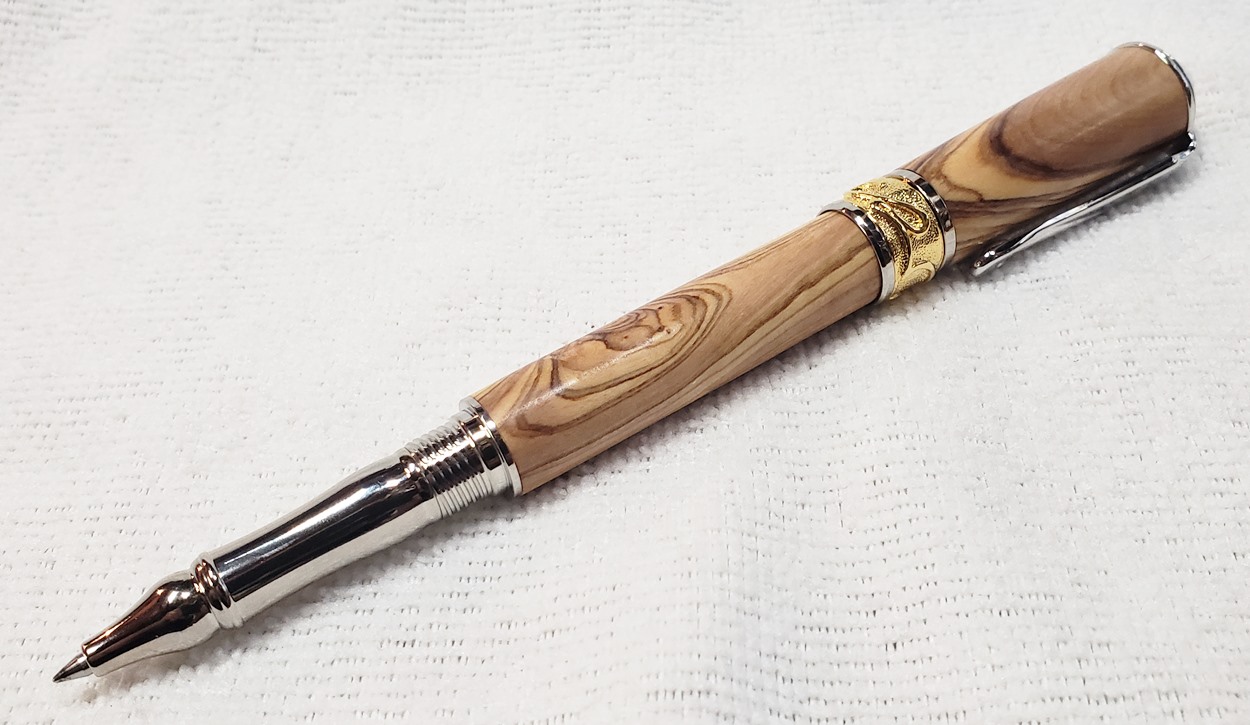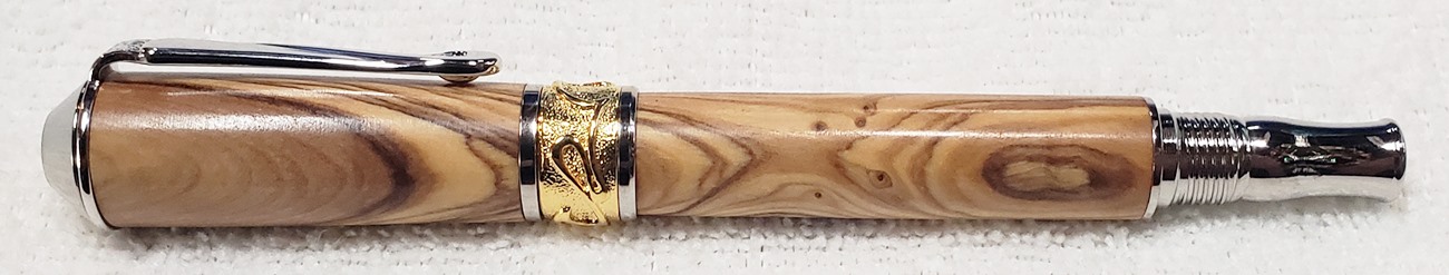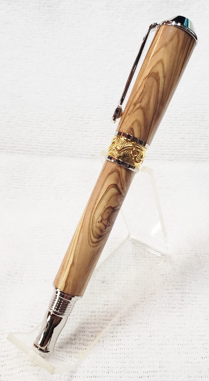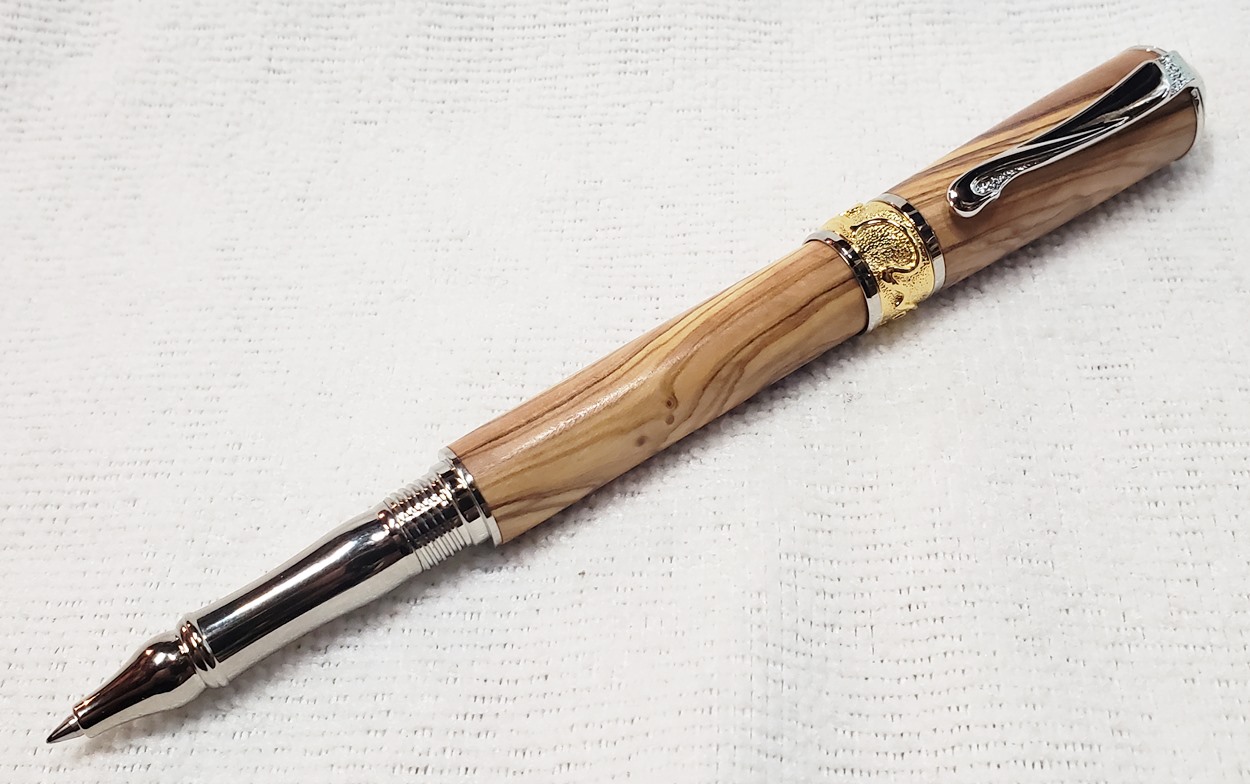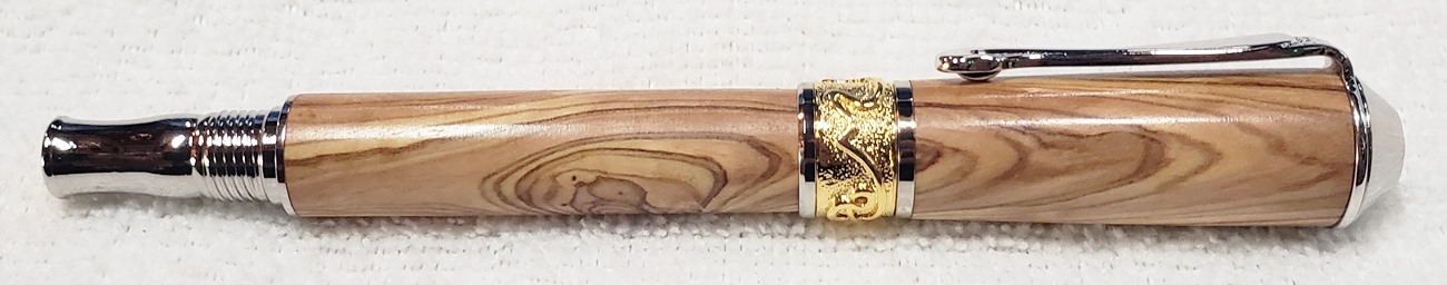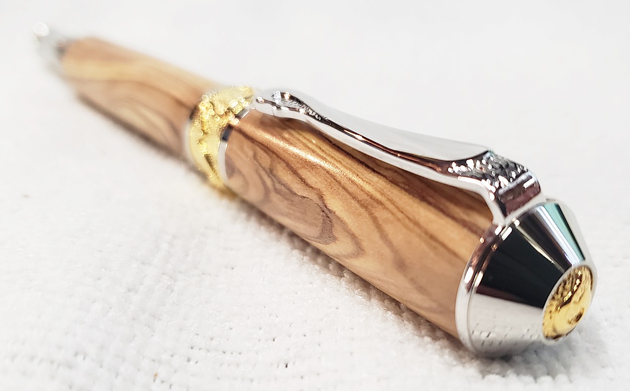 This is a PSI Nouveau Sceptre rollerball in rhodium and gold, that I purchased from Exotic Blanks. The blank is Bethlehem olivewood. I think it pairs well with the kit. The finish is Pens Plus.