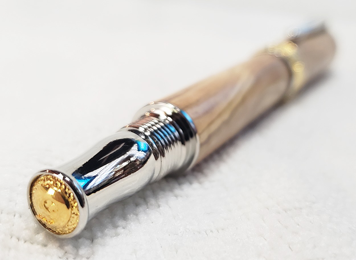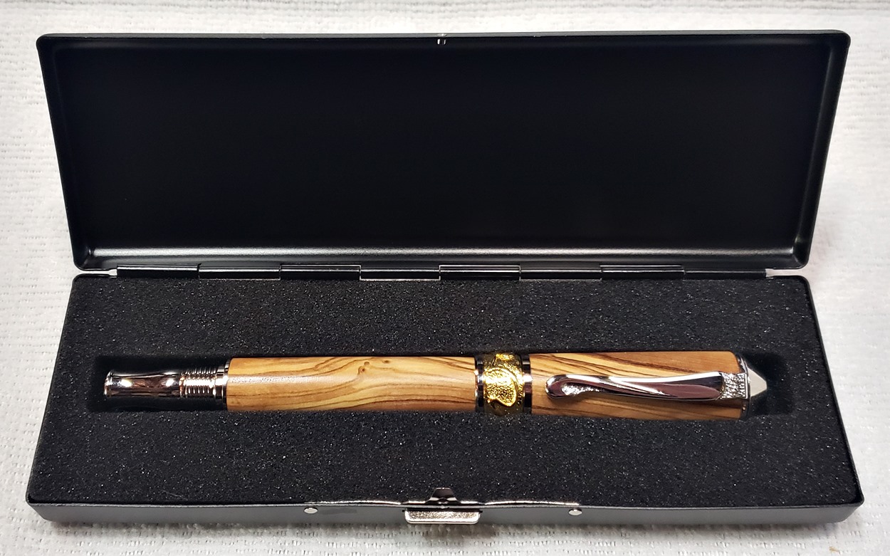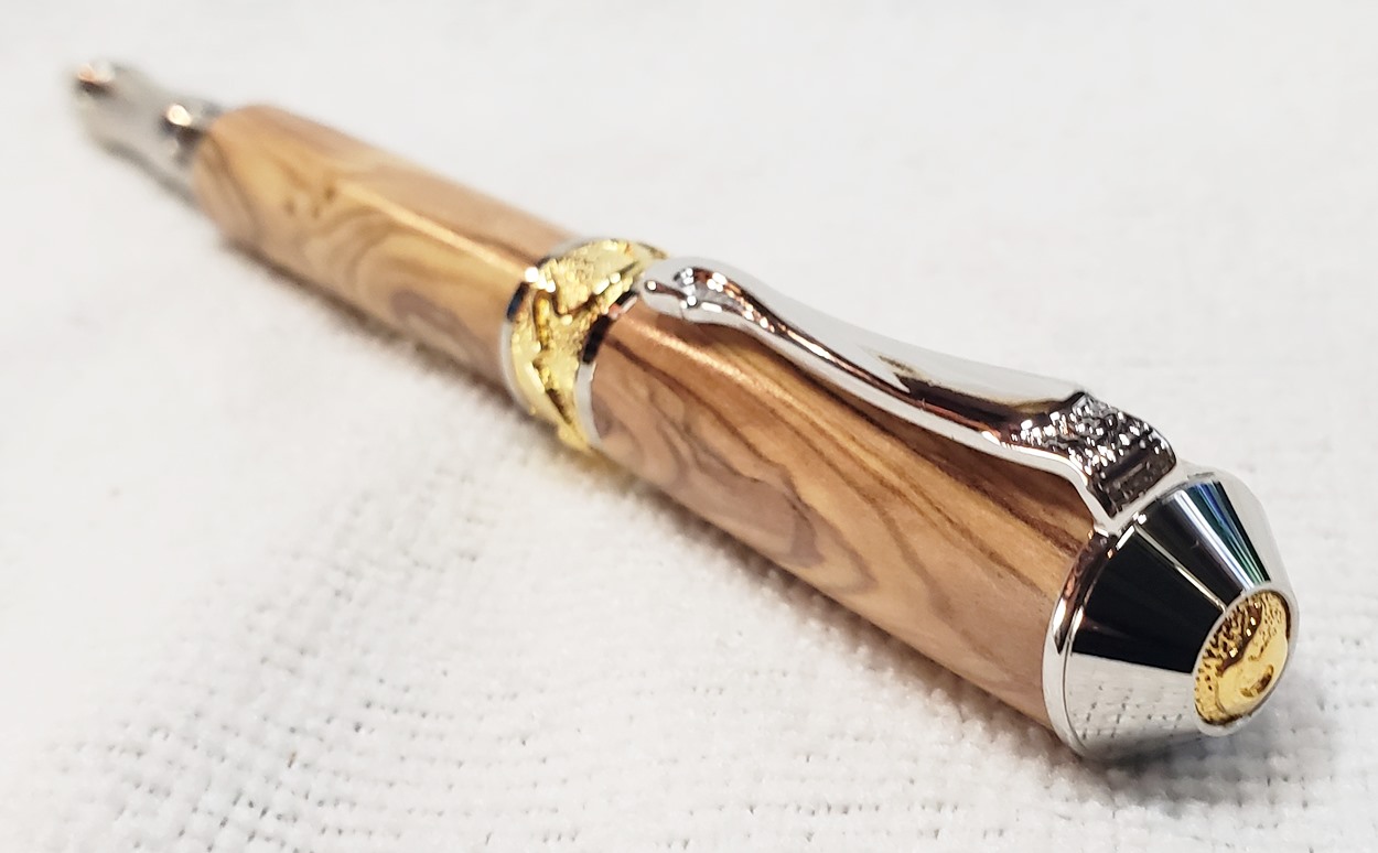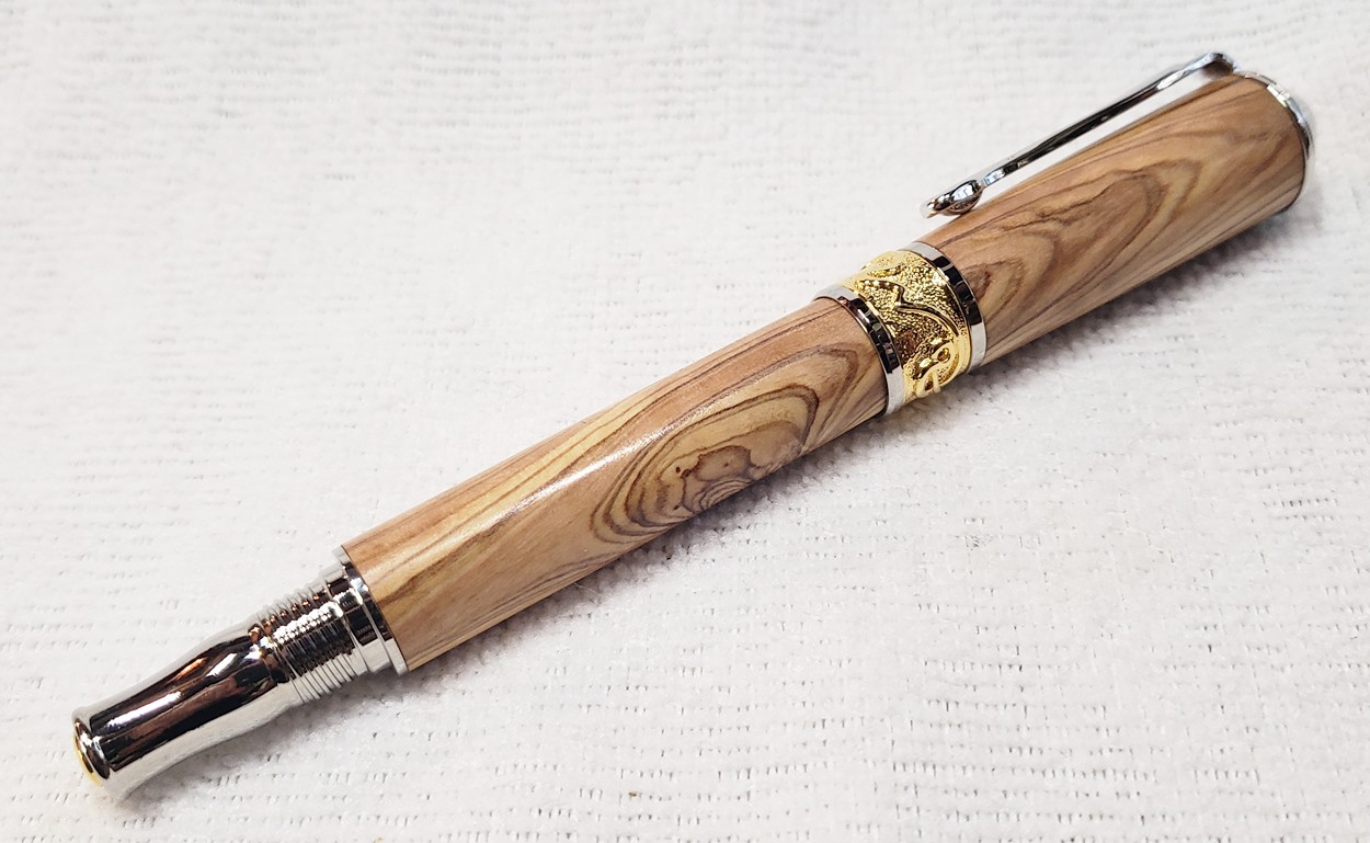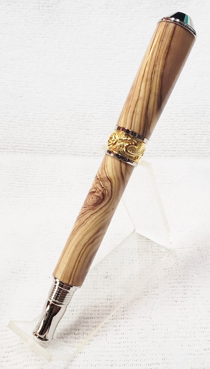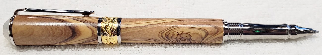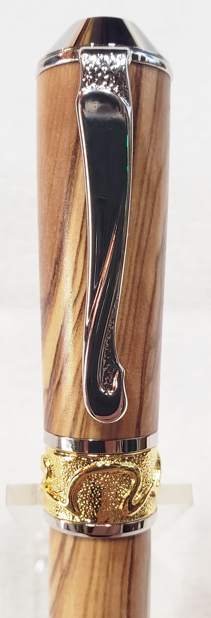 This is a PSI Nouveau Sceptre rollerball in rhodium and gold, that I purchased from Exotic Blanks. The blank is Bethlehem olivewood. I think it pairs well with the kit. The finish is Pens Plus.