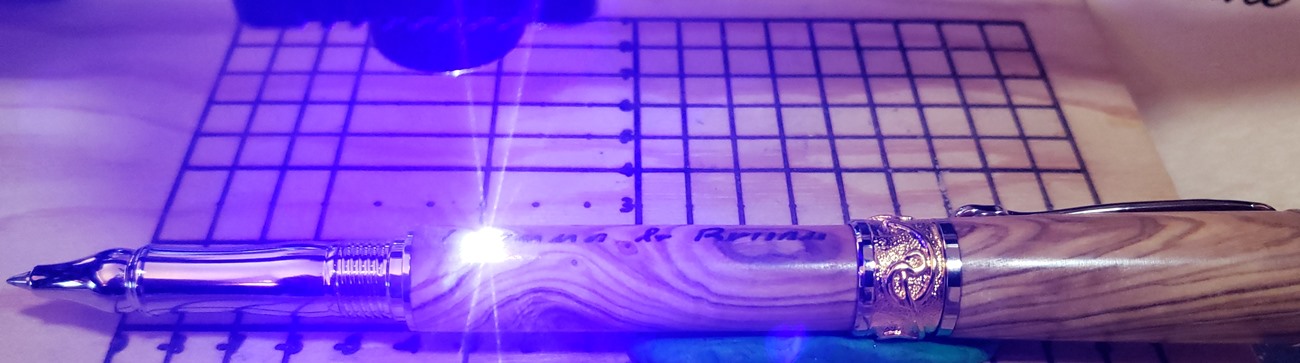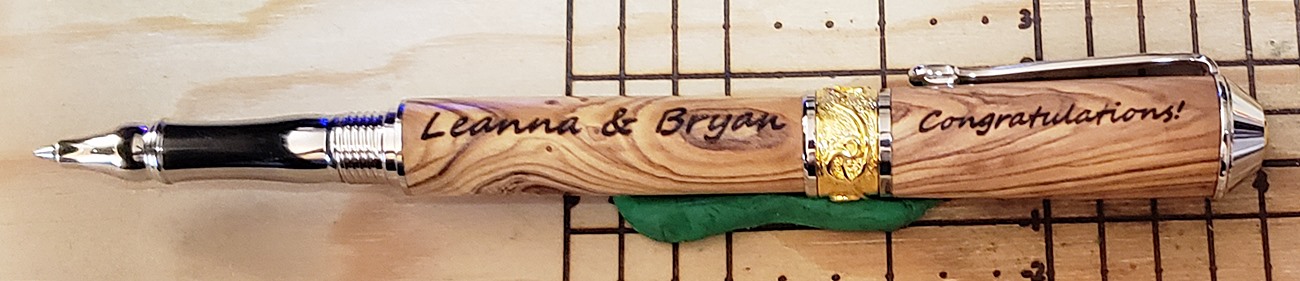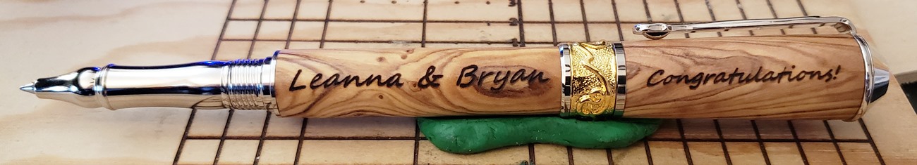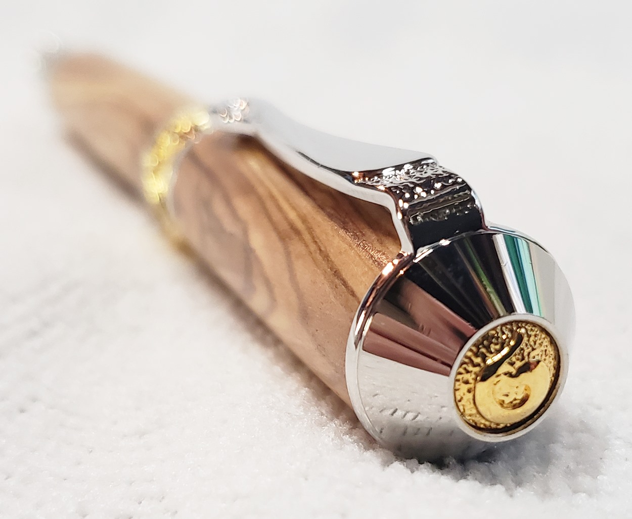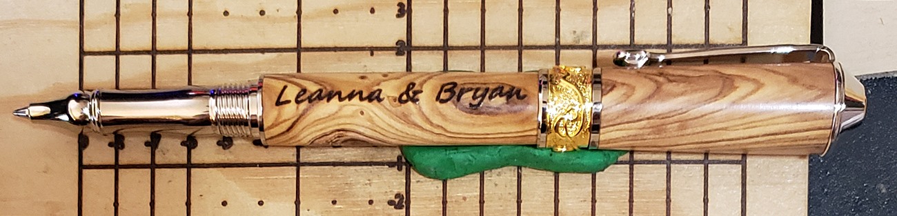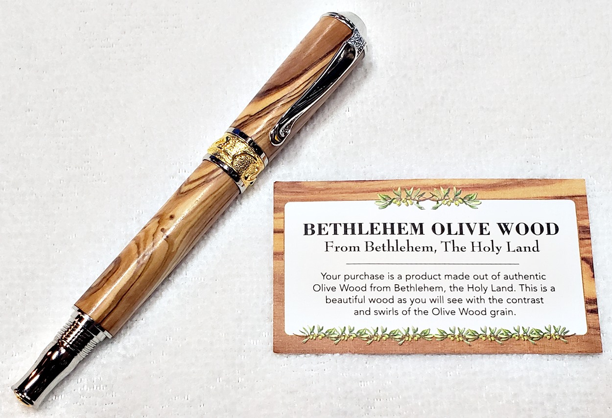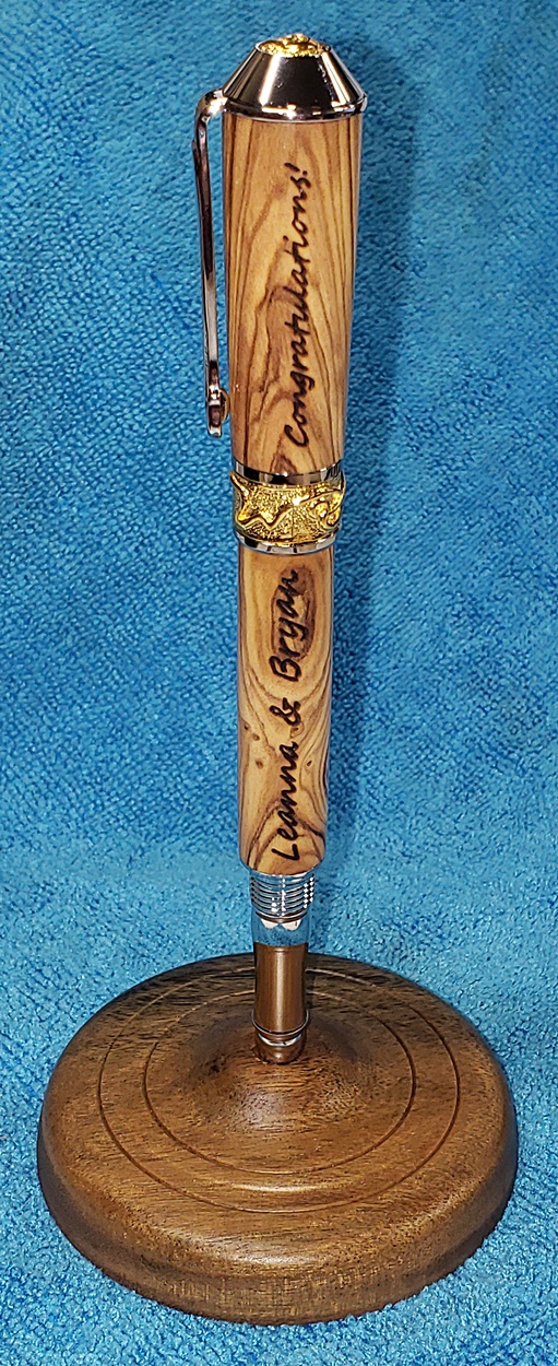 This is a PSI Nouveau Sceptre rollerball in rhodium and gold, that I purchased from Exotic Blanks. The blank is Bethlehem olivewood. I think it pairs well with the kit. The finish is Pens Plus.