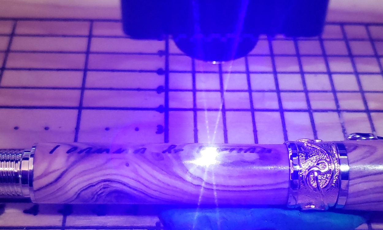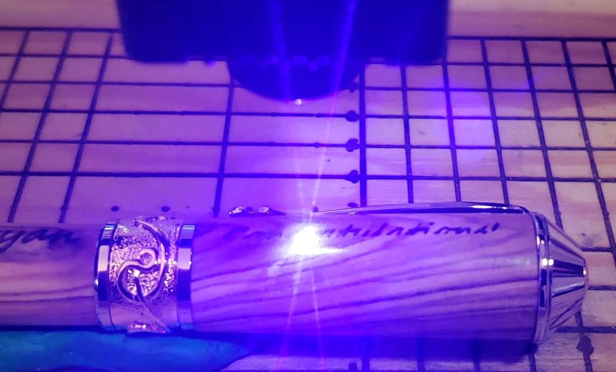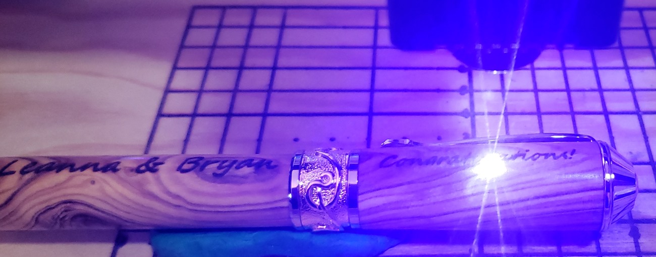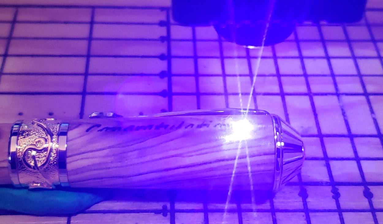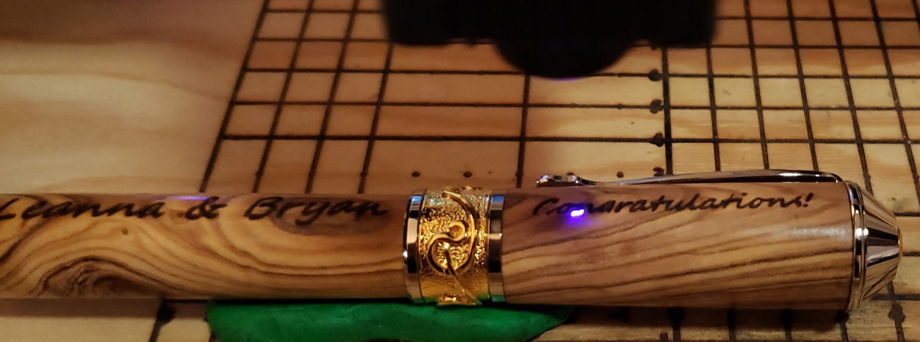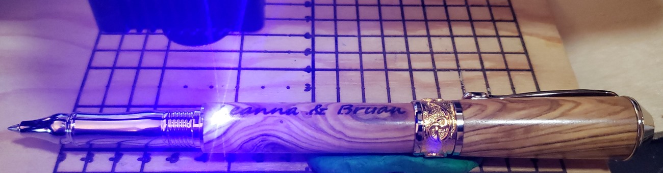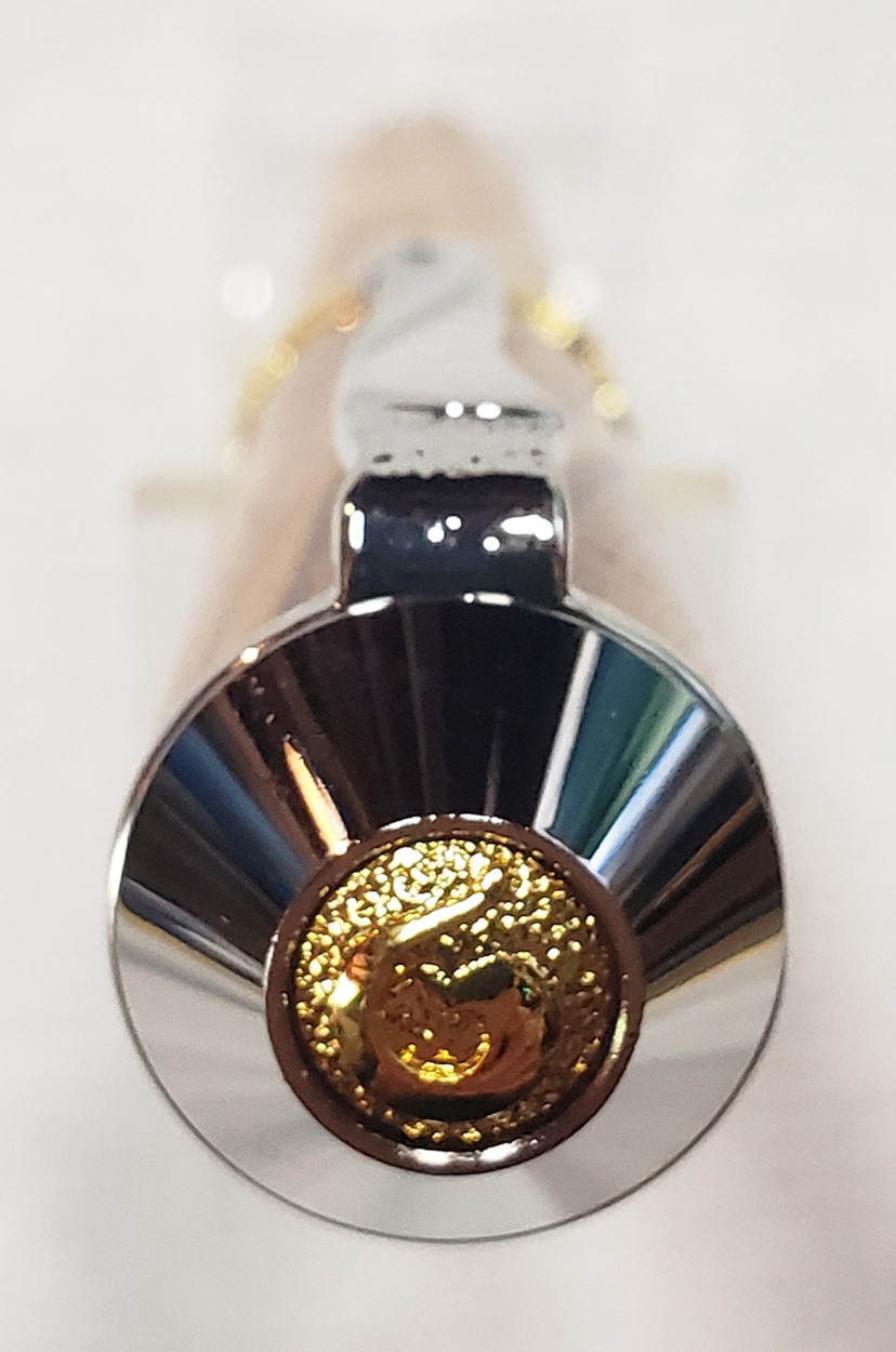 This is a PSI Nouveau Sceptre rollerball in rhodium and gold, that I purchased from Exotic Blanks. The blank is Bethlehem olivewood. I think it pairs well with the kit. The finish is Pens Plus.