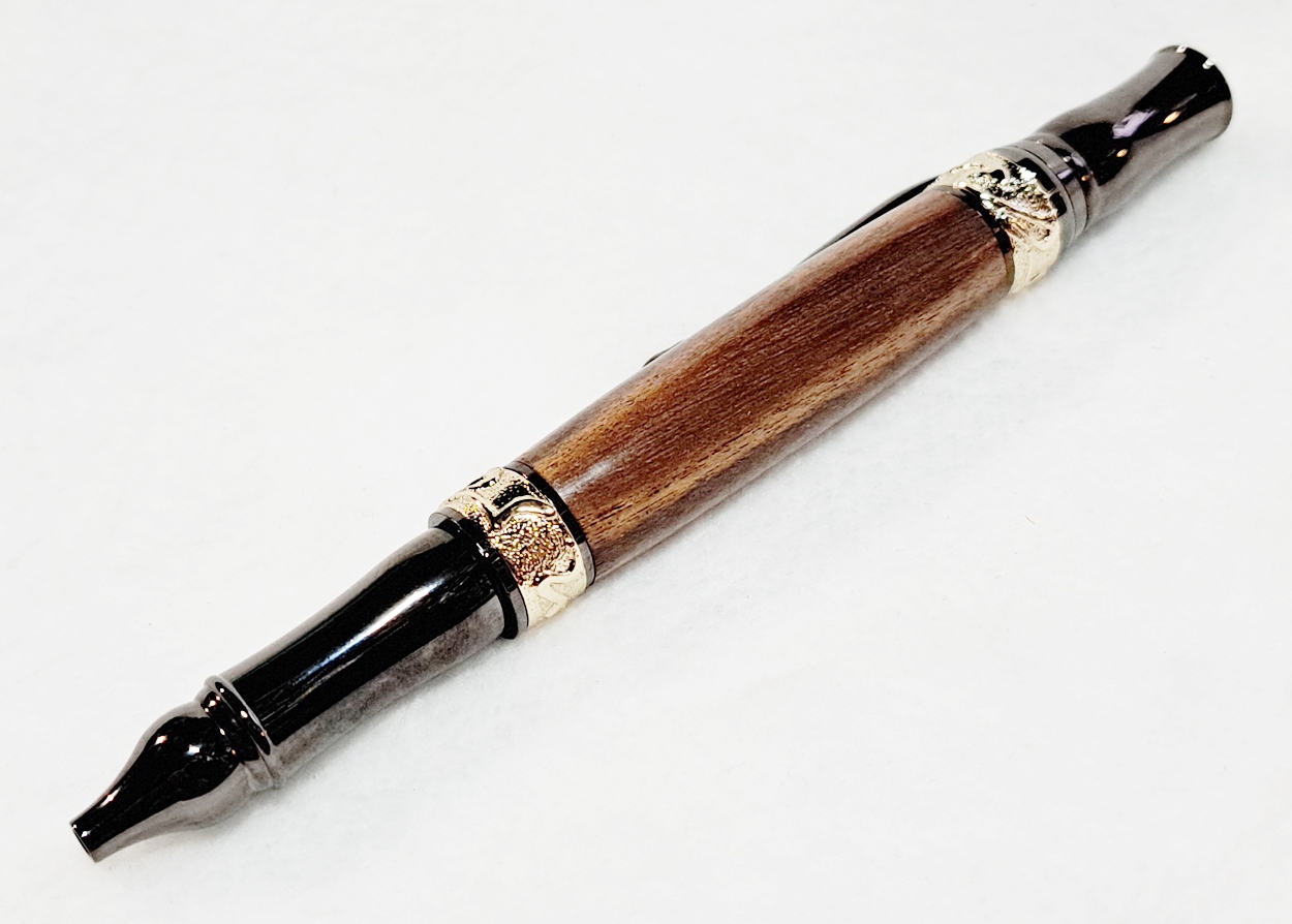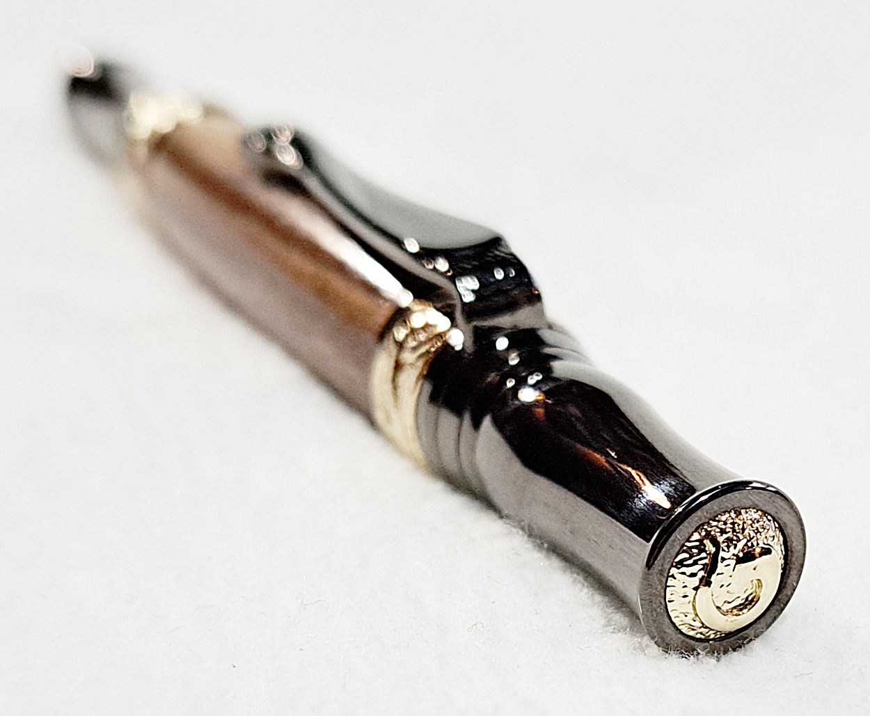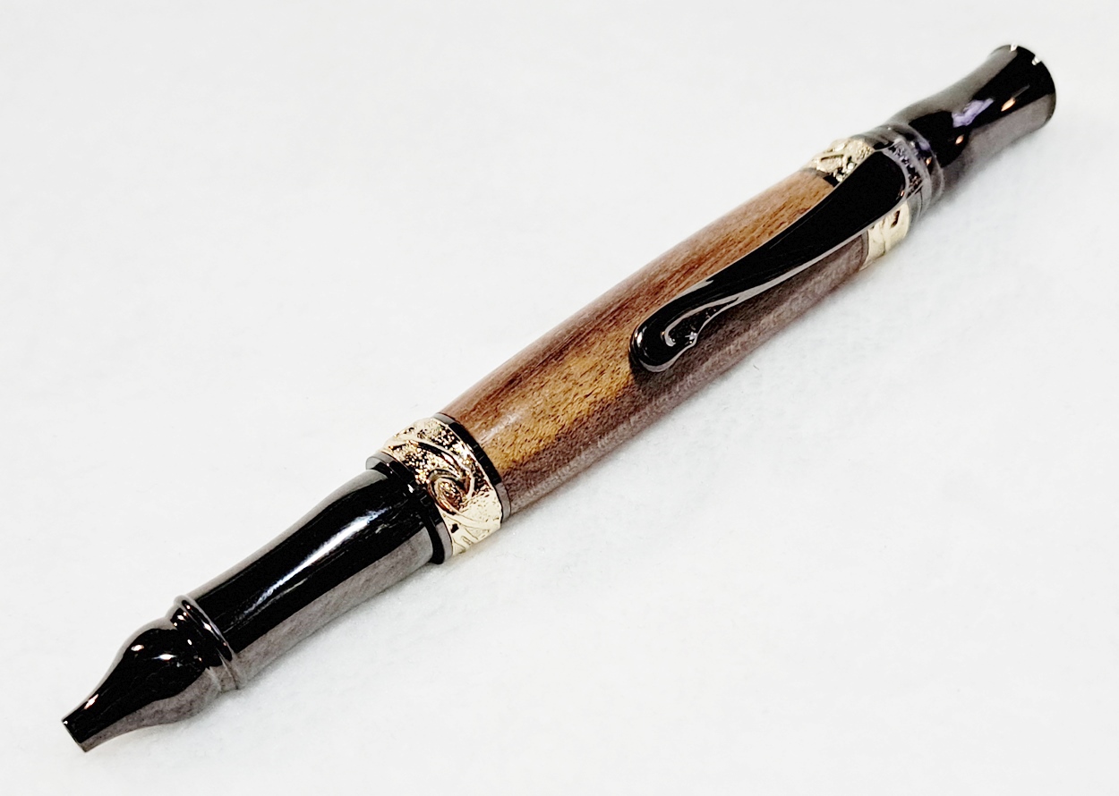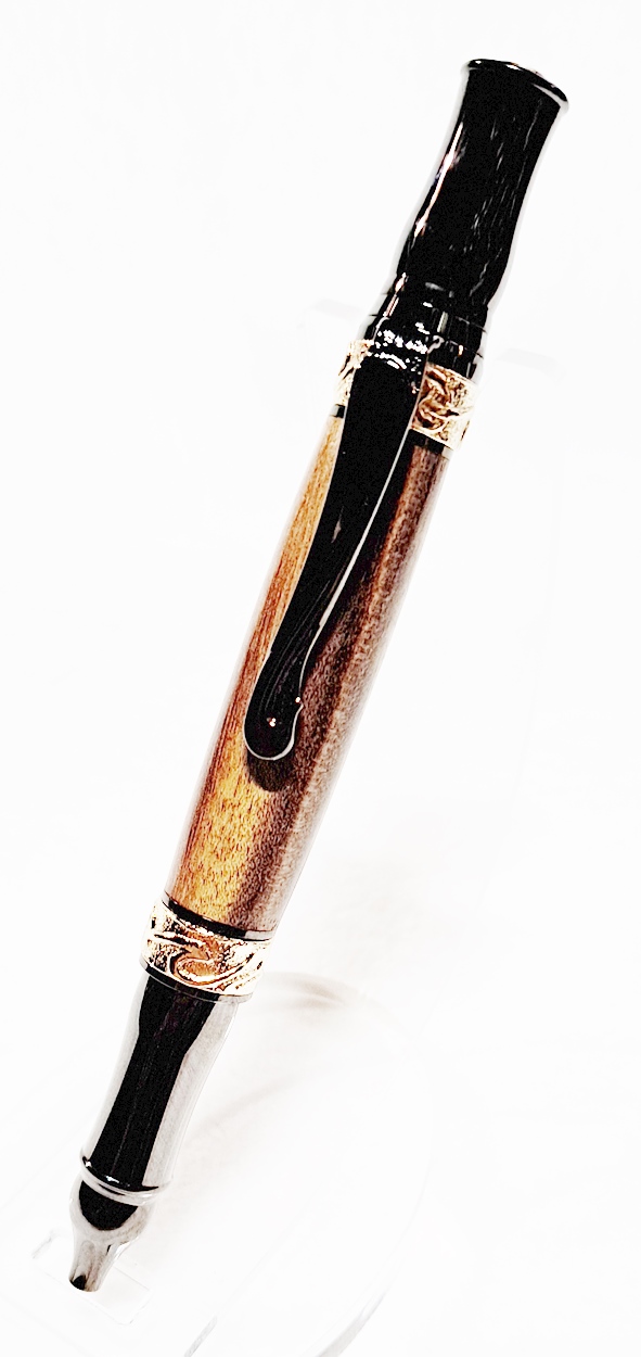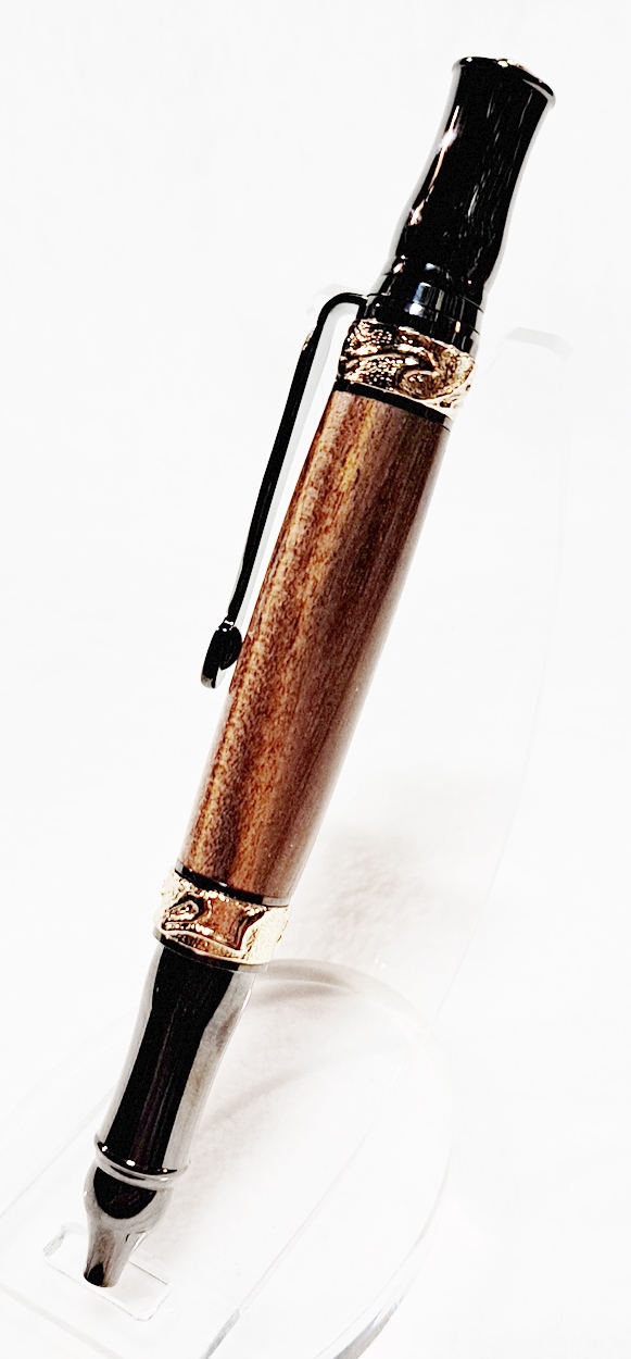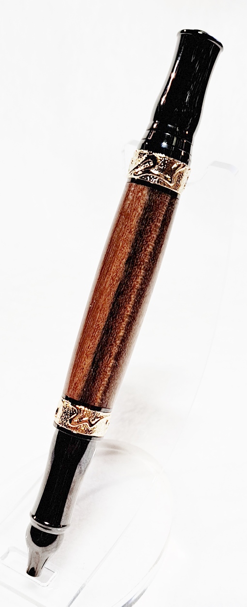 This is a PSI Nouveau Sceptre twist pen in gunmetal and gold. The wood is Patagonia Rosewood from Woodcraft. The finish is Mylands.