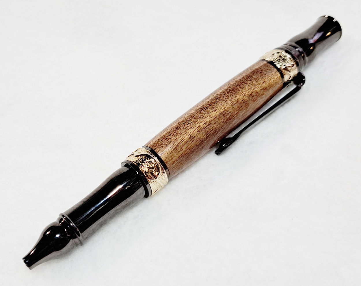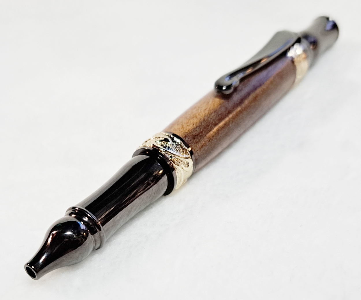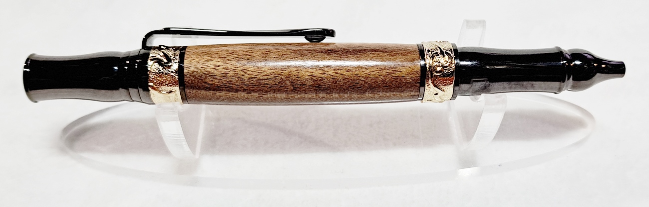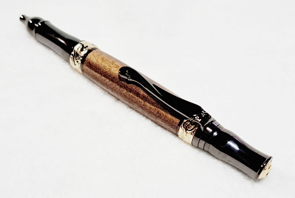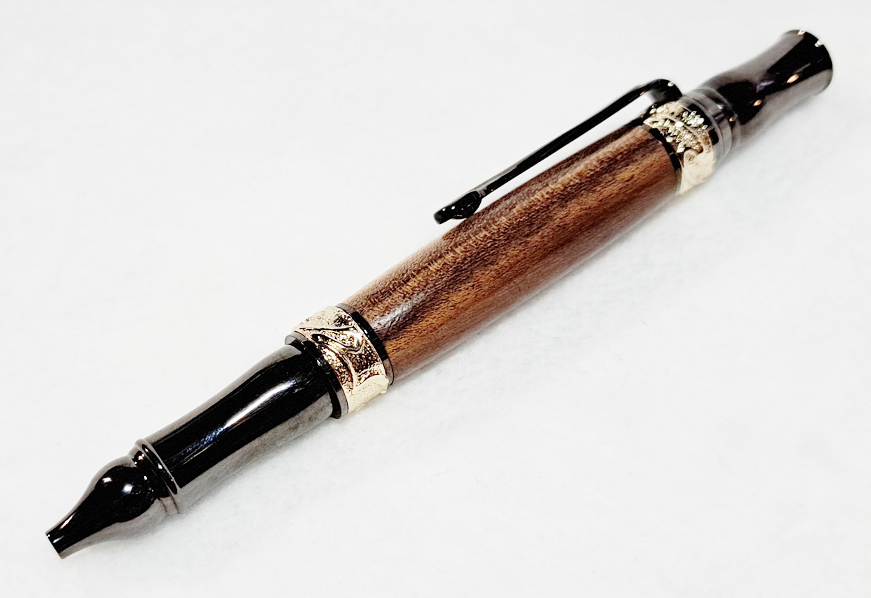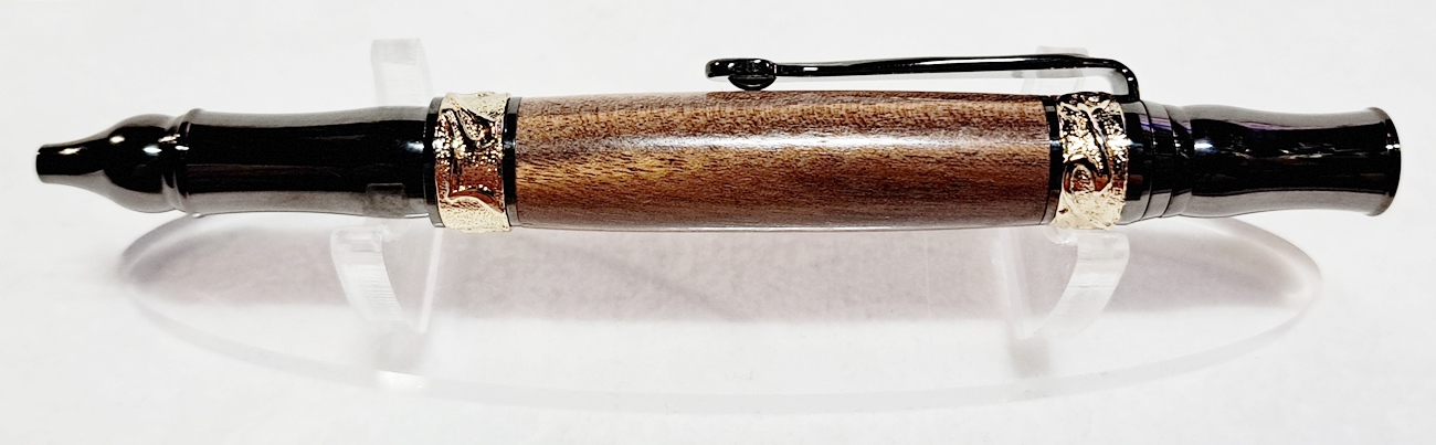 This is a PSI Nouveau Sceptre twist pen in gunmetal and gold. The wood is Patagonia Rosewood from Woodcraft. The finish is Mylands.