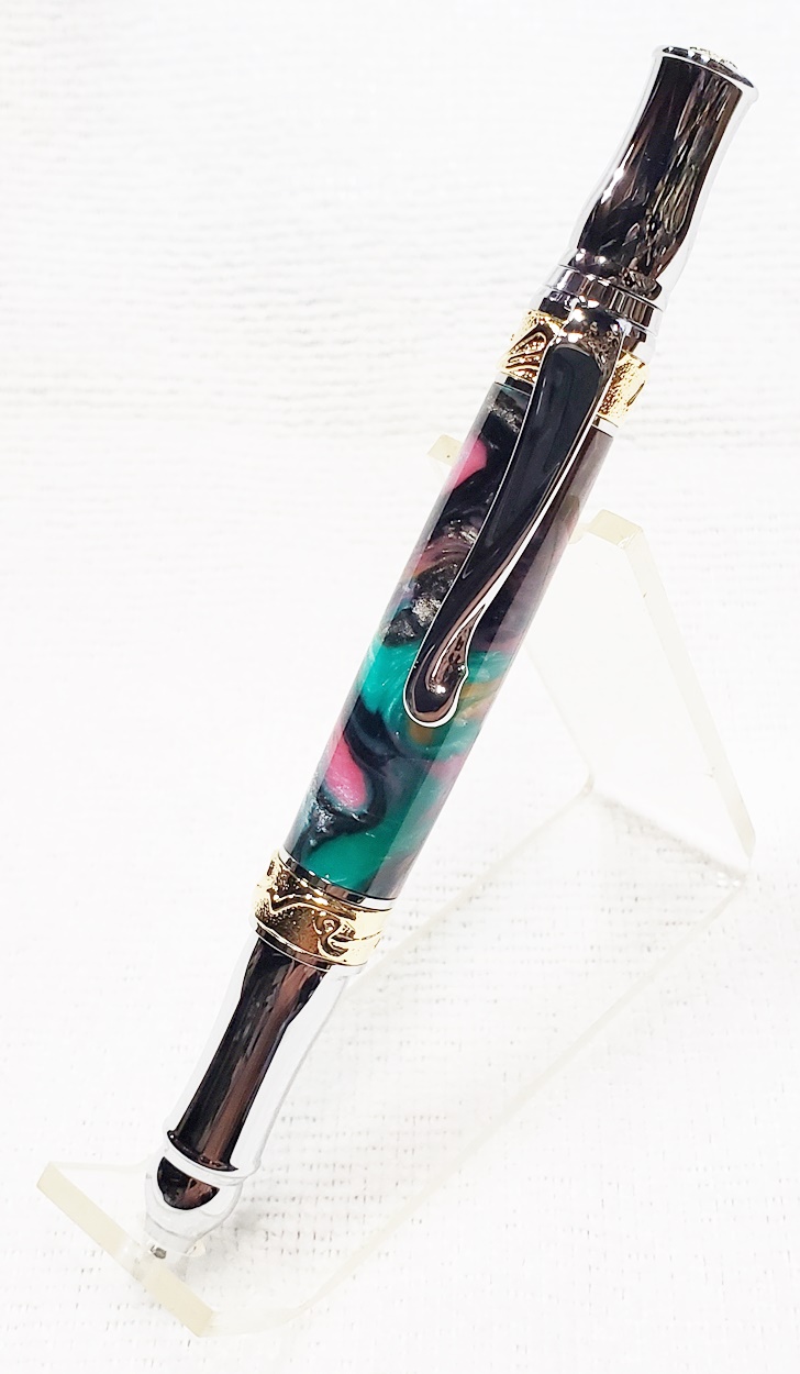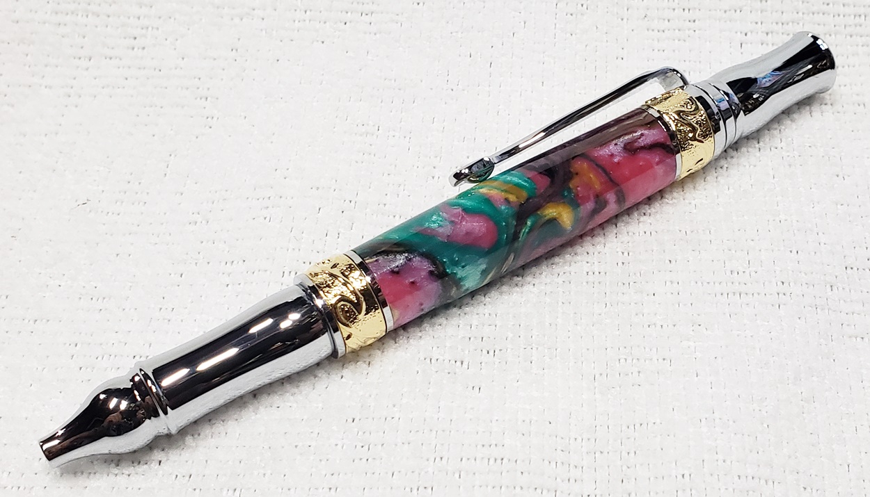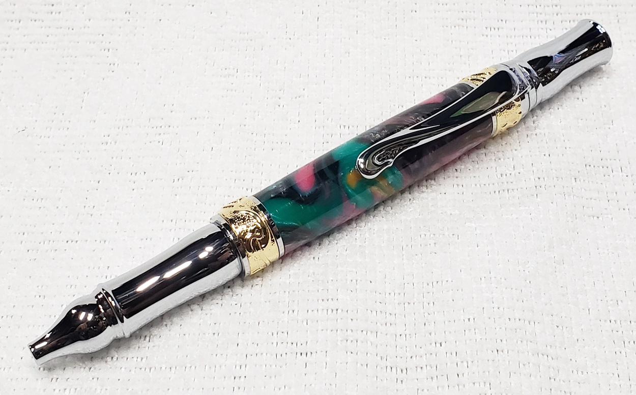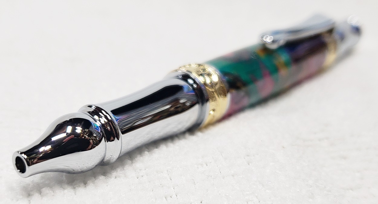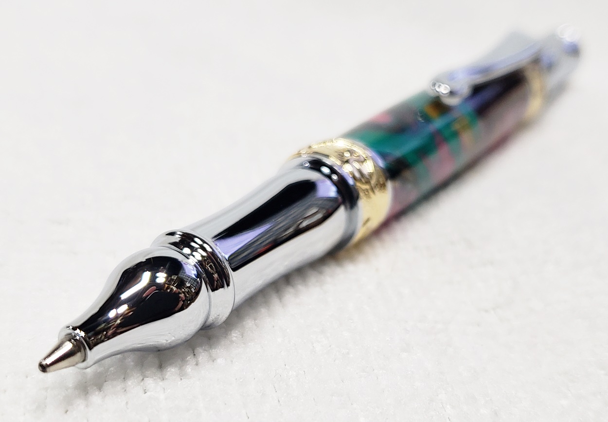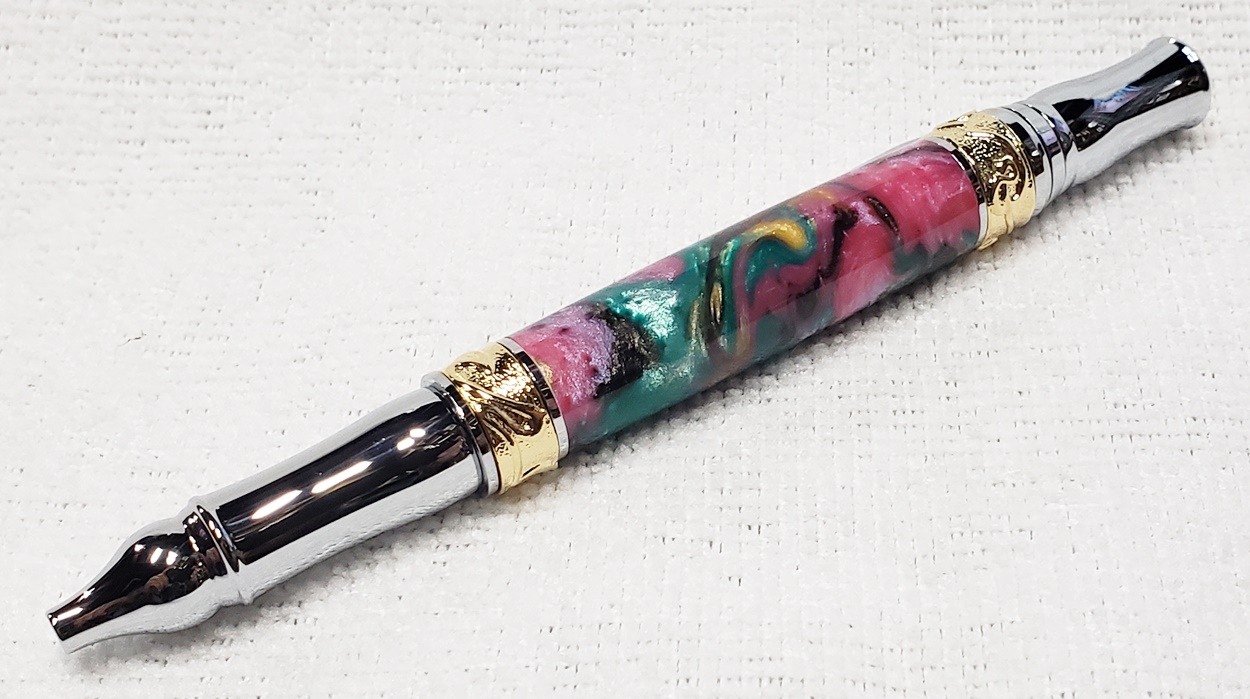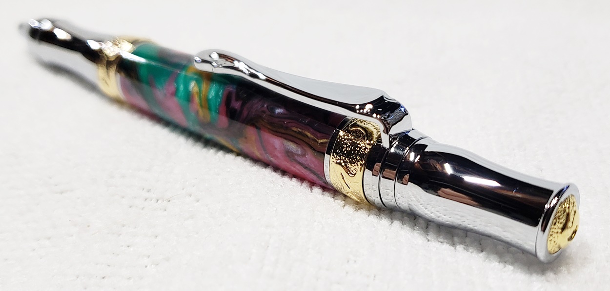 This is a PSI Nouveau Sceptre twist pen, in chrome and gold. The blank is an inlace acrylester from Woodturningz called Abalone. Very, very pretty blank. Made a great looking pen.